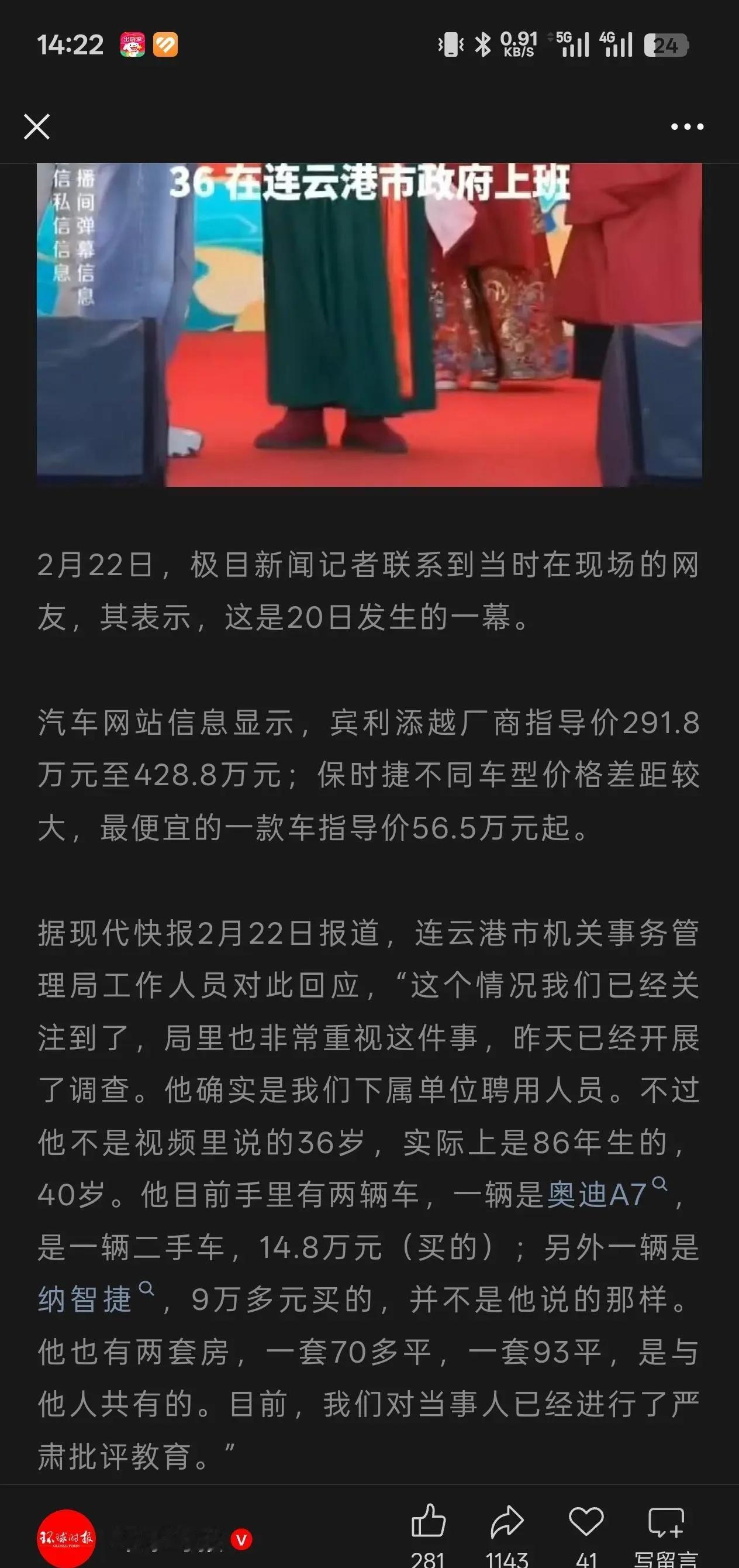 江苏连云港一名男子在热门相亲活动“王婆说媒”中自称公职人员并高调炫富,宣称拥有宾