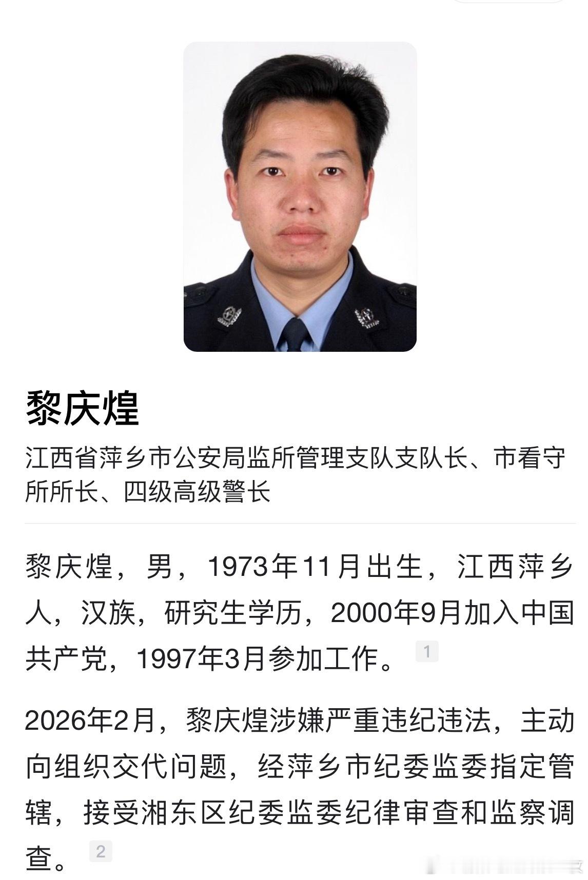萍乡市公安局监所管理支队支队长、市看守所所长、四级高级警长黎庆煌接受纪律审查和监察调查。