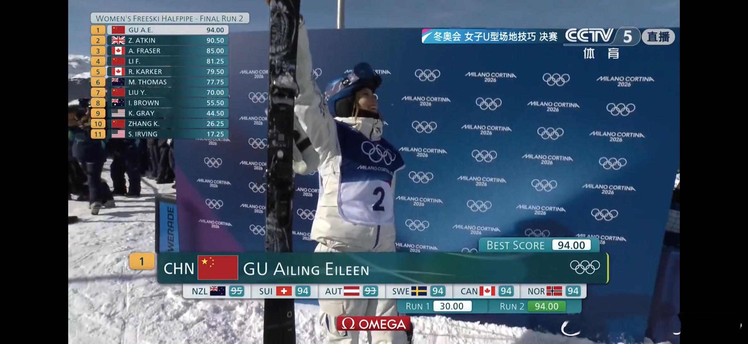 女子U型场地决赛 谷爱凌第二滑94.00分,目前的全场最高分!加油