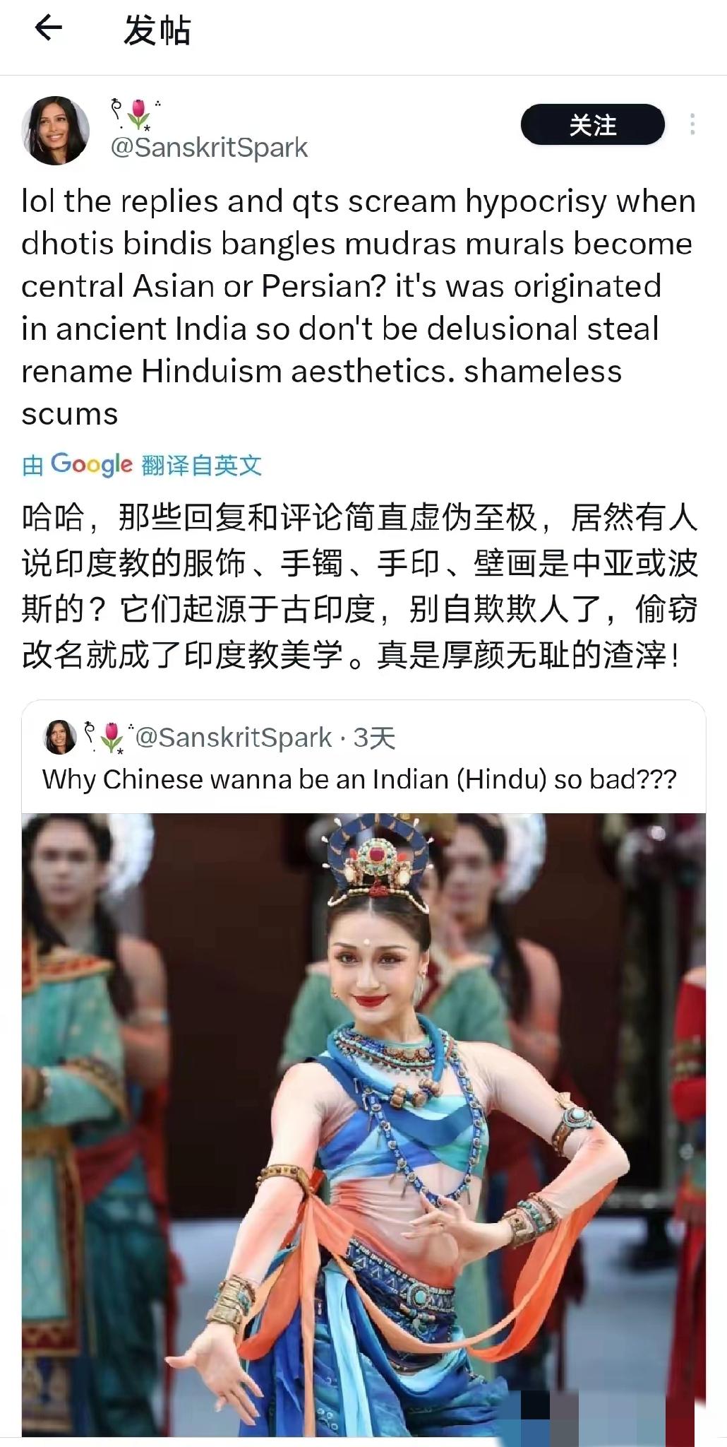 原来盗窃中国文化的不止是韩国、日本和越南,现在印度也开始无耻的碰瓷中国文化了! 现在已经有不少印度人在网络上宣传我们盗窃印度所谓传统服饰和舞蹈了,对于这种没有历史根据,只靠个人臆想得出来的结论,我只能说这些印度人确实是在哗众取宠罢了! 如果你们在深层次的思考一下,就能明白这些印度人为什么现在跳出来诋毁我们了,其实一点都不复杂,就是因为现在的中国是全世界最热的话题,特别是在印度关于任何相关中国的话题,都是热门中的热门! 这样你就理解这些印度人为什么要碰瓷我们中国的真正原因了,既不是为了它们口中的传统文化,也不是为了证明它们才是正统,就是为了点燃印度人那可怜的对中国的民粹主义罢了,还可以利用这个事赚到更多的钱,这就是这件事的本质! 我有的时候在想,这些国家为了一点点利益,可以这么无耻,反倒衬托的我们中国和中国人的素质和道德太高了,这大概就是真正文明的底色吧!