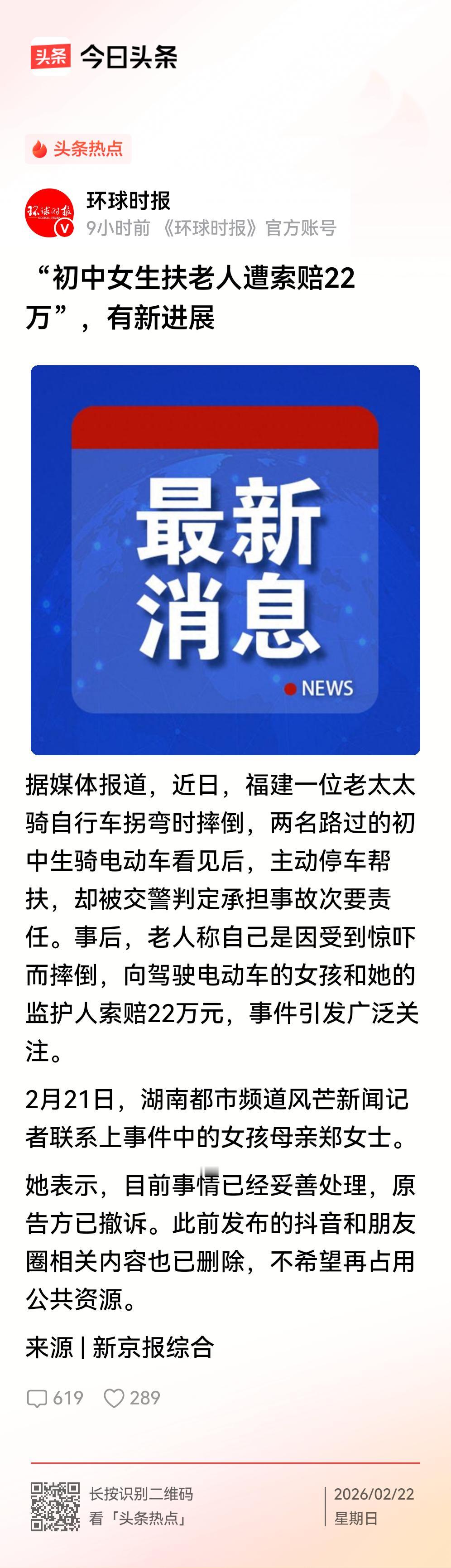 女学生扶老人被索赔22万当事方撤诉!但是这事没完。 被国人瞩目的女学生扶老人被索赔22万事件,女孩的母亲郑女士说,目前事情已经妥善处理,原告方已撤诉。此前发布的抖音和朋友圈相关内容也已删除,不希望再占用公共资源。 看起来,当事方撤诉,事情圆满解决。但是,仔细想起来,这事并没完,网友们的关注点是三点: 一是当事方为啥撤诉?有网友说是当事方感受到了舆论压力。二是公众质疑交管方做出的责任认定依据到底是什么?是不是秉公执法,判责有据?三是此事对两名未成年孩子的影响又该如何弥补? 除此之外,我们还应该看到,作为一名老人,没有监护人自己还能不能骑车出门,还有没有那个能力,又该如何鉴定? 所以说,这件事不能撤诉就完。有关当事交管需要说说清除。否则,会造成较大影响。如果起诉人属于恶意讹诈,必须追究法律责任。对这两名学生勇敢的扶起老人的举动,应该表彰,因为,好孩子就不应该被伤害。同时,要知道,我们更加美好的未来,只能靠阳光有为、有担当的孩子们。 不知道大家以为然否?欢迎批评[作揖]