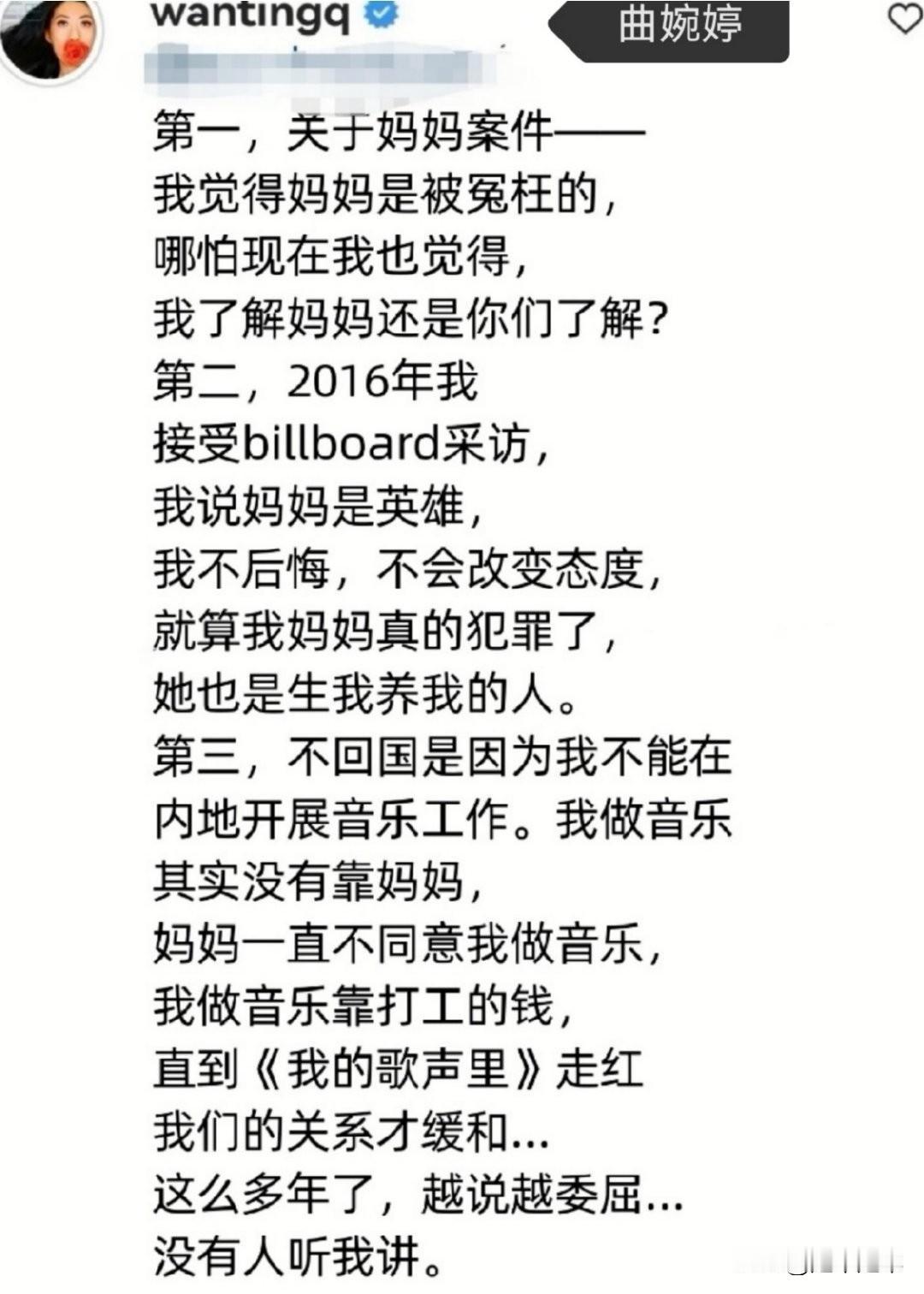 🎵为何让她开号??? 曲婉婷近期以原创音乐人身份认证了🎵账号,IP属地标注为江苏,但仅发布一条弹唱视频并开启仅作者可评论功能限制互动,同时开通了商品橱窗和探店功能(尚未上架商品)。 其母张明杰贪污3.5亿(含566名东北下岗职工安置费)被判无期徒刑,而曲婉婷用赃款在海外享乐却未退还资金争取减刑。 曲婉婷本人长期滞留加拿大并多次公开表示无法回国,有网友指出该账号可能是代运营。但此举引发强烈争议,网友认为这是资本+互联网失忆的表现。曲婉婷近年海外发展遇冷,此次开通国内账号恰逢其母赃款耗尽传闻扩散期,被怀疑是意图通过国内流量变现。相对网易云音乐平台此前已下架其作品表现,🎵要是不做出快速的反应,或会引起网友(尤其是东北)们的愤怒。
