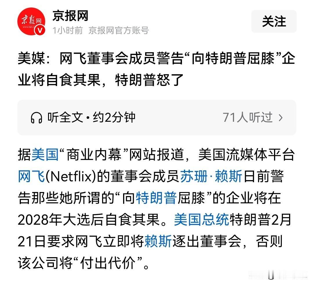 一朝天子一朝臣,网飞董事警告现在跟随特朗普的企业极有可能会被清算 Netflix董事会成员苏珊·赖斯近日通过社交平台警告称,现在跟随特朗普“为非作歹”的企业很有可能在2028年大选之后被“清算”。 自从特朗普再次当选美国总统之后,就开始进行贸易战、关税战,同时也有一大批企业跟随特朗普在美国乃至全球范围内“为非作歹”,而2028年特朗普不可能再次获得大选,所以无论是共和党还是民主党上台之后都会对跟随特朗普的企业进行清算。