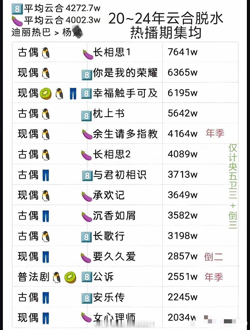 一直都觉得杨紫的戏播出效果要比热巴的好一些,没承想看到网友做的对比图之后,一经对比,平均合计下来,热巴云合集均是4272.7万,而杨紫是4002.3万。