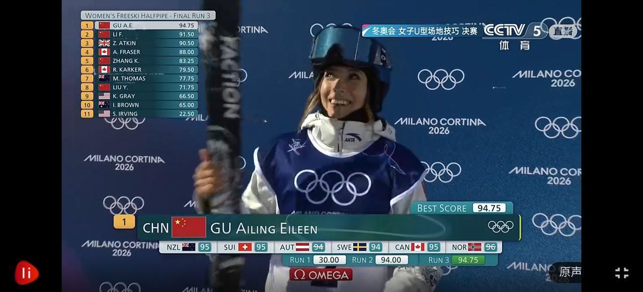 天啊!第三轮谷爱凌又涨分了,94.75!金牌稳了吧? 按解说员所说,她真的天生为滑雪而生,动作飘逸,临危不乱。第一跳失败的情况能迅速调整好。