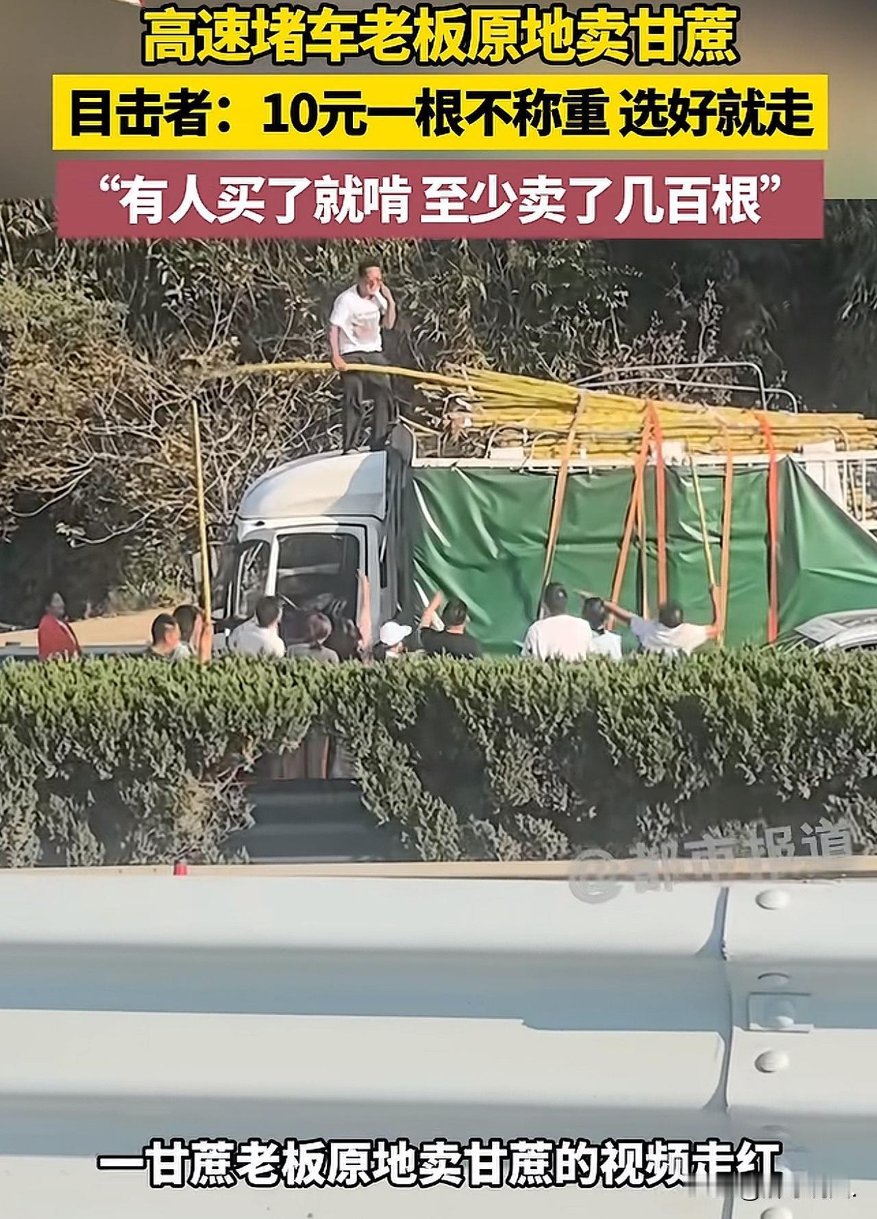“看着是堵车添堵,没想到还能遇上甜事儿。” 云南,男子拉着一车甘蔗上高速,谁知,才上去没多久,就赶上了高峰期,堵得一动不动。就在男子急得直跺脚的时候,有人向他买甘蔗。男子也是爽快人,10元一根,坐地摆摊,直接卖出几百根。网友:再堵下去,一车甘蔗都能卖光! 2月20日,春节返程高峰正盛,云南墨江境内的昆磨高速上,返程车流汇成一眼望不到头的长队,几十公里路段瞬间变成了“巨型停车场”。 引擎声渐息,焦躁的情绪在停滞的车流里悄悄蔓延,不少车主摇下车窗叹气,孩子们趴在车门边百无聊赖,漫长的等待让本该热闹的归途变得枯燥又难熬。 就在这时,一辆满载新鲜甘蔗的小货车,成了整条拥堵路段的焦点。 车主本是赶着去市场送货的蔗农,没想到被堵在了半路,看着满车青翠甘甜的甘蔗,正发愁耽误了生意。 周围被困的车主们又渴又乏,有人率先凑上前试探着问:“师傅,您这甘蔗卖不卖?堵着也是堵着,解解乏也好!” 一问激起千层浪,越来越多的人围了过来,纷纷想买根甘蔗润润嗓子。蔗农老板索性一拍大腿,当场支起了“高速临时小摊”,干脆利落地喊出:10元一根,不称重、不削皮,随便挑、选好就走! 没有繁琐的称重计价,没有磨人的讨价还价,车主们下车精挑细选,瞅准粗壮饱满的甘蔗,扫码付款就能拎走。 有人当场掰断甘蔗,咔嚓咔嚓啃得香甜,清甜的汁水驱散了堵车的烦躁;有人一口气买了三五根,塞进后备箱带回家,让这份意外的甜蜜延续;就连对向车道的车主,也隔着护栏挥手喊话下单,小小的甘蔗摊,让原本沉闷的高速路瞬间热闹起来。 目击者文先生说,原本枯燥的堵车时光,因为这个临时甘蔗摊变得格外有意思。 蔗农老板忙得不亦乐乎,短短几小时就卖出了几百根甘蔗,既解了自己送货被堵的难题,又给被困的车主们送去了清甜与慰藉。 此事曝光后,立刻引发了网友热议: 有人表示几百根甘蔗秒空,看来大家堵车都憋坏了,一根甘蔗拯救一路心情。 也有人称赞生意人脑子就是活,坏事变好事,既不耽误自己还方便了别人。 没有商业气息的刻意雕琢,没有斤斤计较的琐碎纷争,这场高速路上的临时买卖,藏着最质朴的人间烟火。 一根甘蔗,一口清甜,化解了归途的疲惫,融化了堵车的焦躁,让原本糟心的返程路,多了一份温暖又有趣的小确幸,也成了这个春运里最甜的独家记忆。 不过温馨提醒的是,根据《公路法》第47条规定:任何单位和个人不得在公路上及公路用地范围内摆摊设点、堆放物品、倾倒垃圾、设置障碍、挖沟引水、利用公路边沟排放污物或者进行其他损坏、污染公路和影响公路畅通的活动。 高速公路车流密集、车速快,占道摆摊极易引发二次事故、阻碍紧急救援,虽然这件事充满烟火气,但安全与合规才是出行的底线,此类行为并不值得效仿。 欢迎关注@解豸说法.