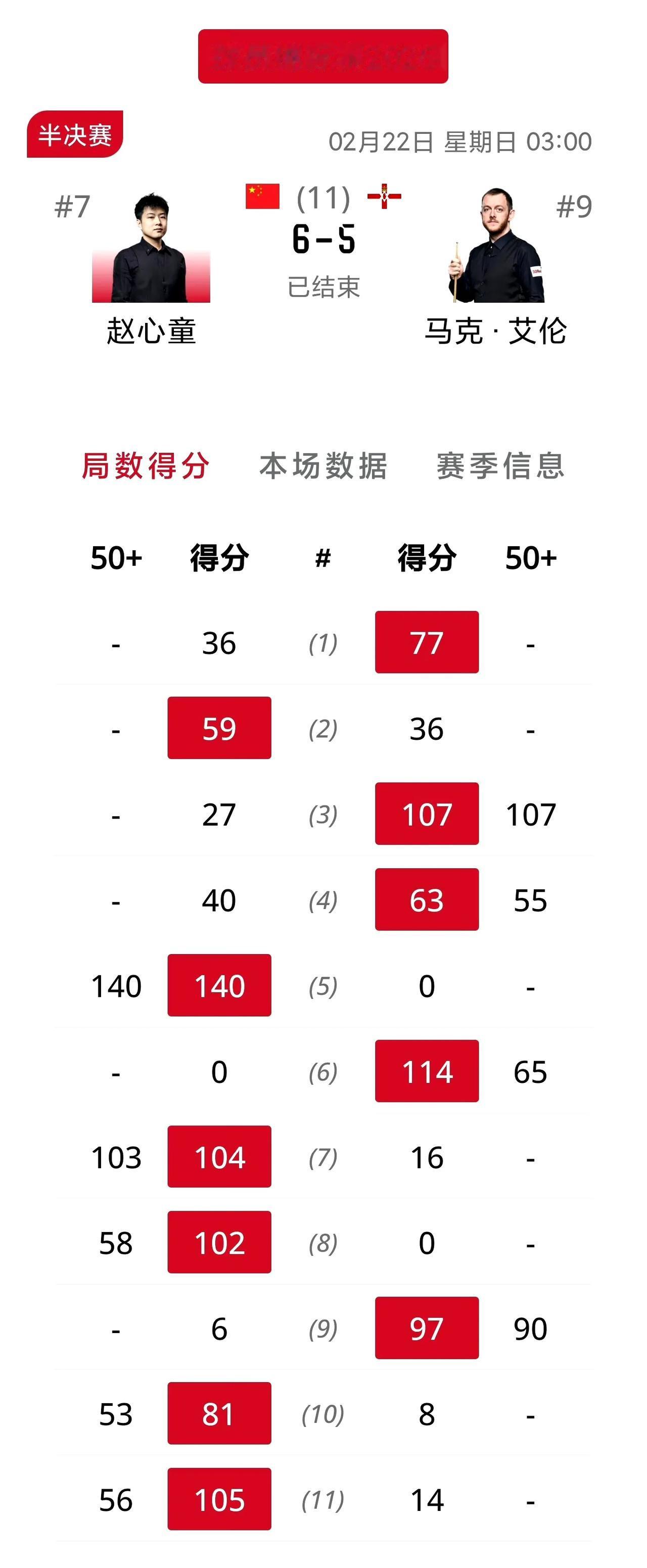 赵心童绝杀艾伦挺进决赛!两场半决赛都经历了一波三折的剧情,不到最后时刻不知道谁能笑到最后,赵心童为国手证明了自己,虽然被艾伦先拿到了赛点,但是大心脏出生的赵公子最后两局没有让机会溜走,敢打敢拼,没有一点保守,拿下胜利,决赛再战希金斯