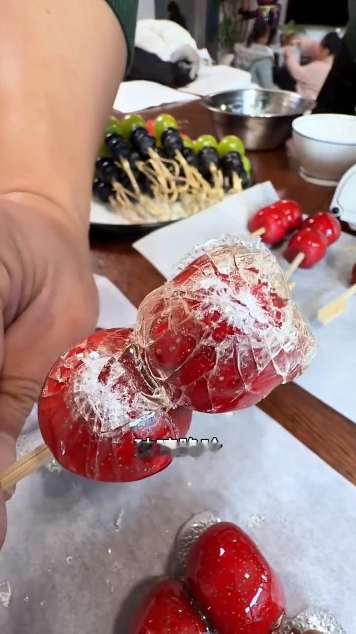 糖葫芦是拍出来的,看没朋友们?我以前就是在地铁站摆摊卖糖葫芦,就靠这个养家生活的一个人。是的,我把我这些小技巧分享给大家。 ·朋友们,这个水不用很多,糖能湿了就行了,水越多蒸发时间不就长吗?你就会质疑自己,这糖是老是嫩,啥时候好?对,这糖慢慢它化了,一下都不搅,搅拌会反沙。 ·做糖葫芦没有铲子的事,你看我这没铲子,没有。来朋友们,糖水变成糖浆了,它变稠了,是不是?是。这个时候你不用担心,你说稠了,赶紧拿竹签蘸一点试试,还远不到火候。为什么?因为还没有糖的香味了,你就是沾上一点,然后你往水里一放,它也是黏糊的,它连成型都不成型,是不是没有? ·跟大伙说火候,开始的时候可以中火,到这后面就中小火就行了,尤其糖出香味的时候,有香味了。真正糖到火候以后,你往水里一放,会震你手一下,通过竹签穿你手上,震一下而且你还会听见啪的声音。 ·你别看你只蘸了一小滴糖,已经硬了,脆的,但是这时候火候不到,它会粘牙的。糖起密集的小泡泡,很快,就是说话间的功夫。然后从这开始,你就来回的尝试,来回的尝试,有了,震你手了,震了,对,它已经那个什么了,很硬了,凉透,然后拿下来,脆了,这火候太棒了。 ·然后快速晃,把锅泡沫晃起来,这盆就用上了,电着锅,蘸的时候就只滚表面。朋友们,还拍一下,拍,对,糖葫芦是拍出来的,你只有摔过的,上面富裕的糖才会下去,它才会薄,薄才能更脆更好吃。 ·这刚蘸完的,这还热着,还烫手,这真跟玻璃碴碎了似的,玻璃脆,扎嘴。这就火候到了,不粘牙也不粘糯米纸。 之前好多朋友做成功了,在评论区晒图。还有好多朋友问,说小曲这个冰糖葫芦已经做的很好吃了,但是为什么它光化?就是糖化是正常的,朋友们,你在外面站着它就不化了,因为外面有风。糖葫芦怕什么?怕下雾,你屋里开着加湿器,你开暖气都没事,但是你要开加湿器,它马上就化。 外面越刮风,这糖葫芦越结越结实,尤其是水果的,要用这种方签去穿它,还有草莓,不然它会打滑的,你蘸糖的时候会自转,它就掉了,你做的时候就麻烦。像这一盒在我们那30块钱,就这种带蓝莓带草莓的,朋友们,有需要这个小签小盒的,我橱窗有。 放假了,朋友们给家里小朋友们做,高高兴兴一吃,祝大伙成功!晚安!马上这不也过年过节了吗,也能露一手,祝大伙新年快乐!