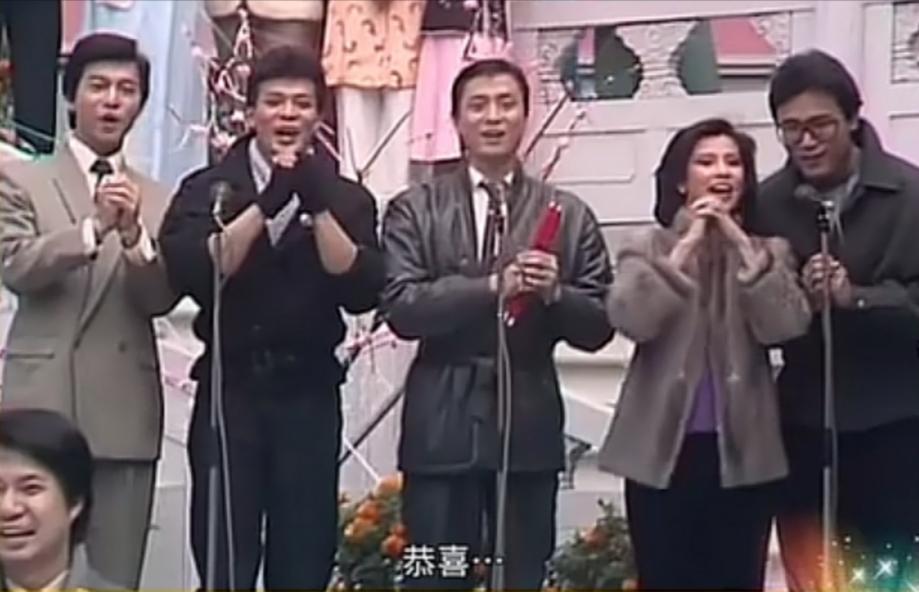 这是1984年,翁美玲和黄日华、汤镇业、苗侨伟、惠天赐给大家拜年的场景,感觉翁美玲的站位好奇怪哦,四男一女,不知道她为何不站中间?现实中和汤镇业是男女朋友,为什么不和汤镇业共用一个麦克风?荧幕上和黄日华塑造了最经典的郭靖黄蓉,她又没和黄日华站在一起,而是和苗侨伟共用一个麦克风,两个人还靠那么近