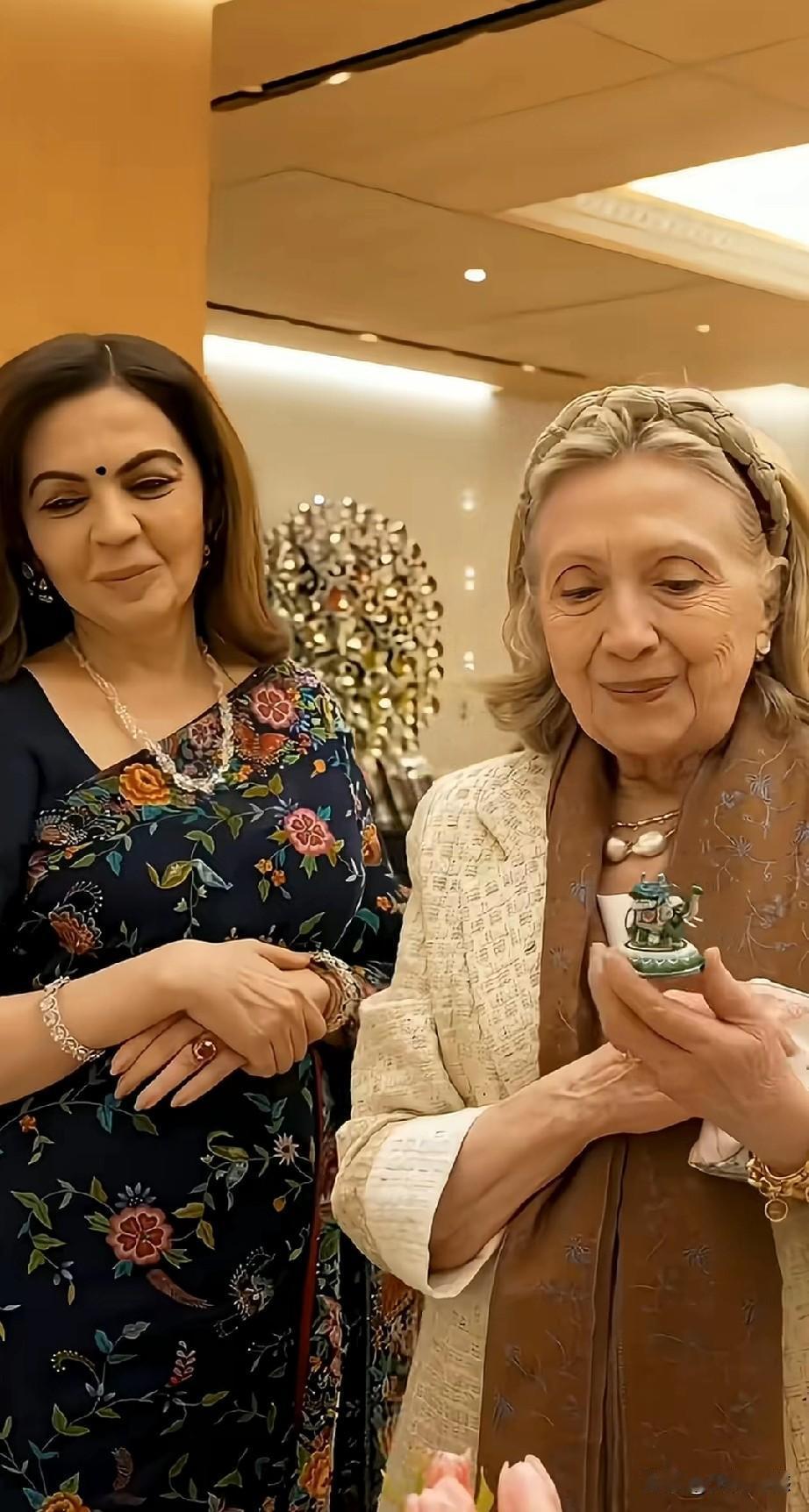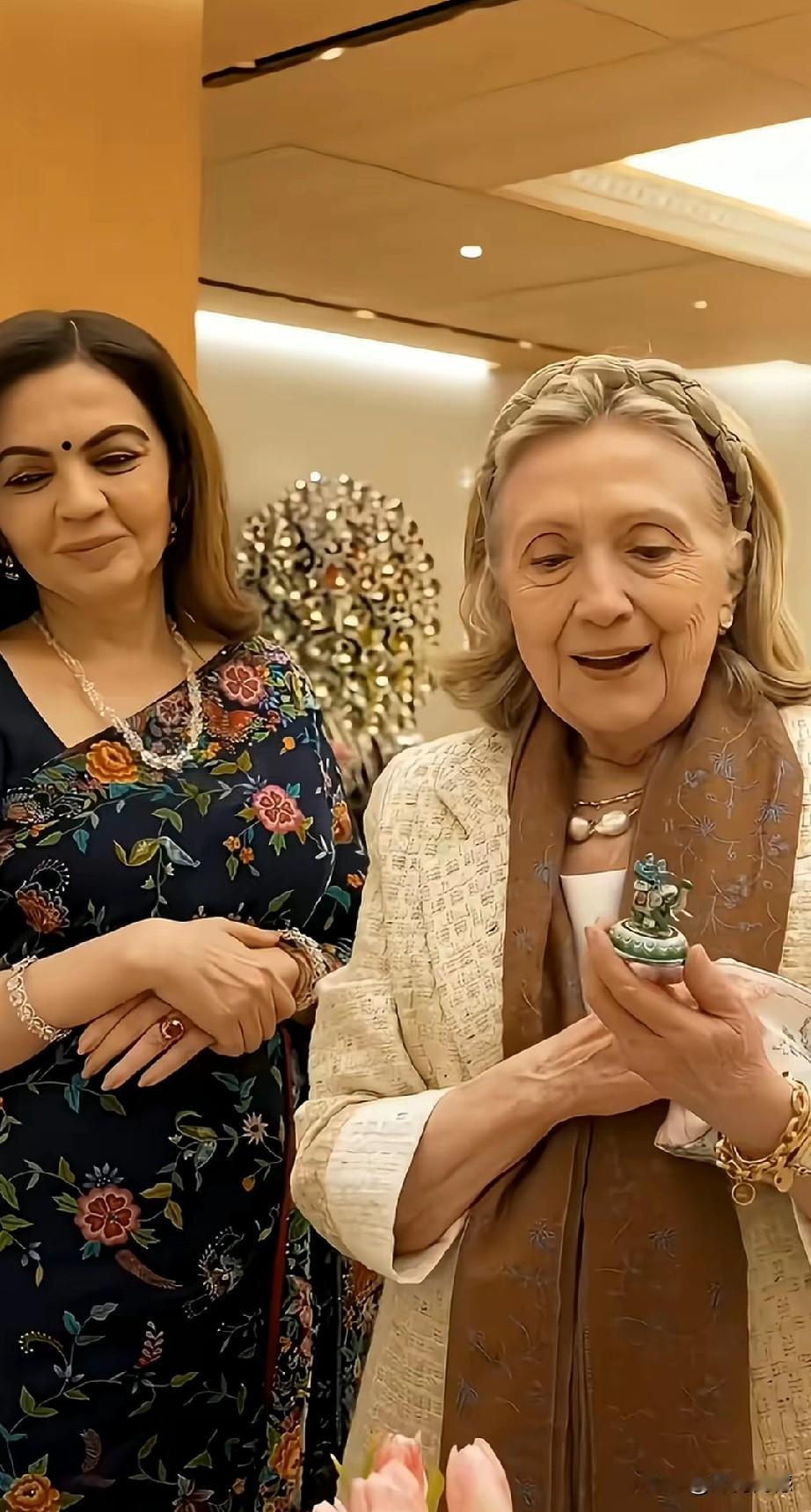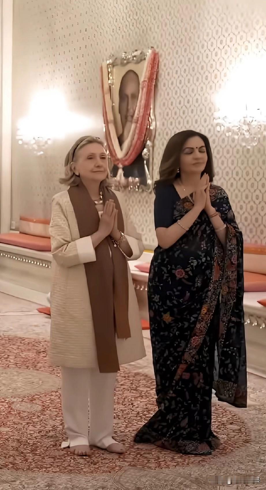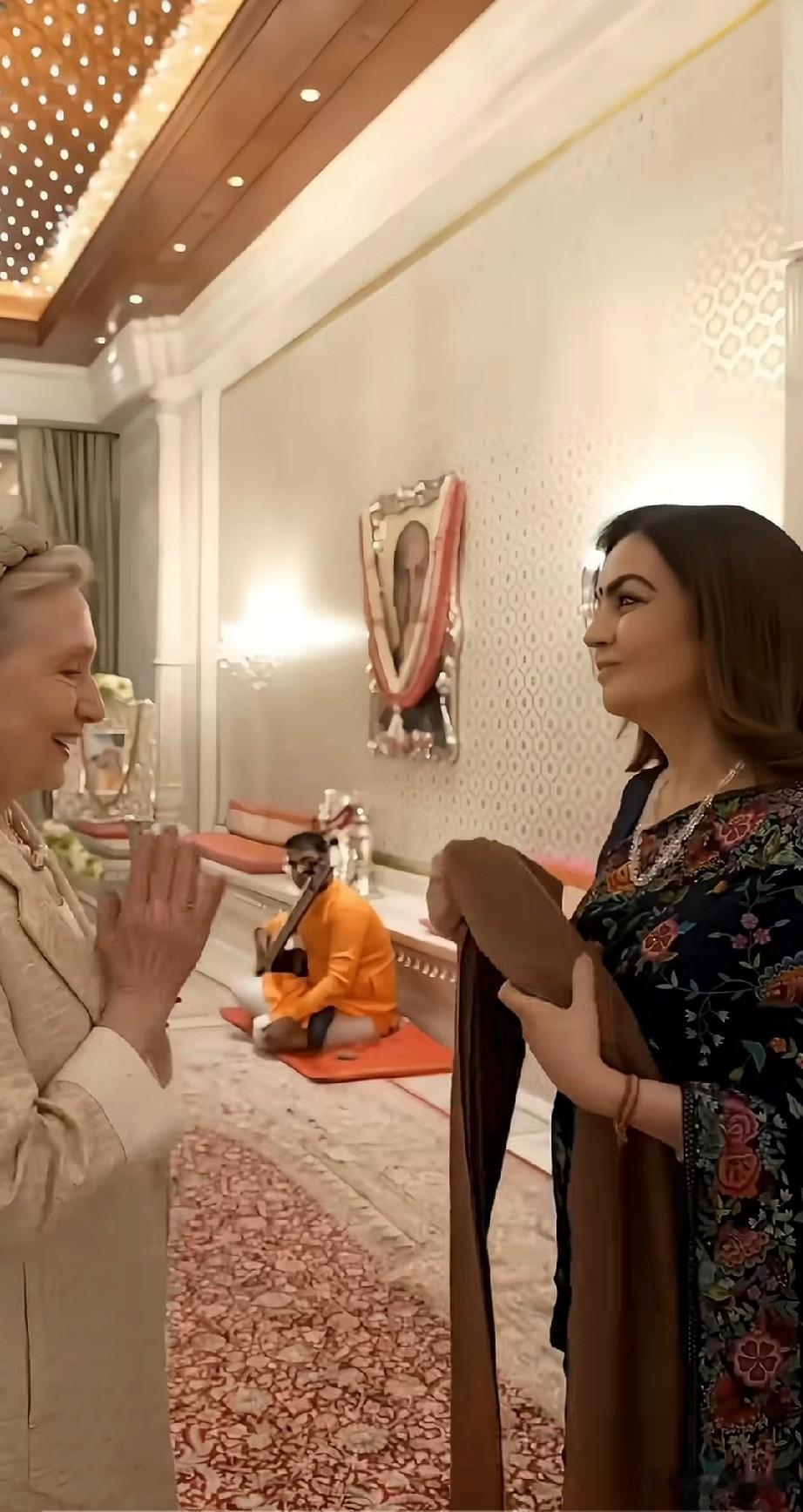 希拉里和印度首富妻子在一起,感觉他们的关系非同一般,两个人见面之后亲切的拥抱,首富的夫人又为希拉里献上了一条围脖,在这里也发现一个非常细节的问题,希拉里和首富夫人在一起的时候,尤其是她们站在地毯上的时候,希拉里好像没有穿鞋!
