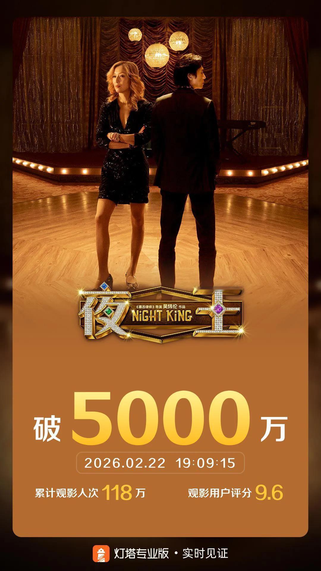 《夜王》票房破5千万,获广东省票房亚军。 由吴炜伦执导,黄子华、郑秀文、谢君豪、王丹妮、廖子妤、杨伟伦、卢镇业主演的春节档粤语喜剧电影《夜王》,内地累计综合票房破5千万,已超越《重返·狼群》首映加重映的总票房,暂居2026春节档第6名,未来有望超越《星河入梦》。 虽然《夜王》在内地是大年初四才上映,但因为其定位精准,取得了相当不错的上座率成绩,并连续三天拿下广东省单日票房亚军,算是春节档分众影片的成功典范。电影夜王