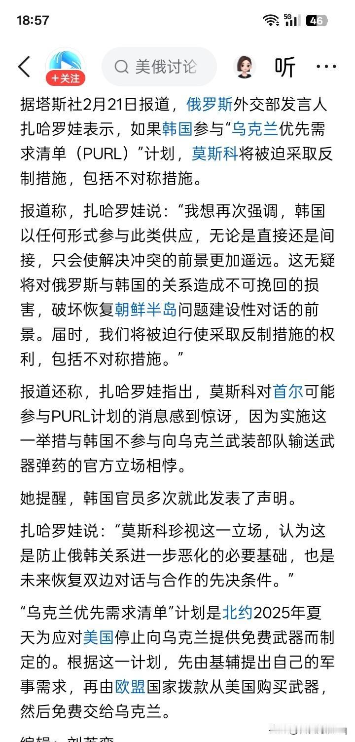 反制过来吗? 听闻说韩国已经参加“乌克兰优先需求清单”计划。所谓的优先需求,似乎就是乌克兰在战场上需要、或急需的武器弹药的具体项目,报告给参加“优先需要清单”计划的国家,由他们分别出资购买清单上的武器装备,之后提供给乌克兰军队用于作战。 俄罗斯外交部发言人扎哈罗娃警告韩国,如果韩国参加“乌克兰优先需求清单”计划,将对韩国进行反制。 但是,照目前的情况看,好像俄罗斯反制的国家绝对不仅仅是韩国,而是可能还有很多的国家。然而,俄罗斯反制过来吗? 而且,一个被西方国家百般制裁的俄罗斯,反制又能反制个什么呢?