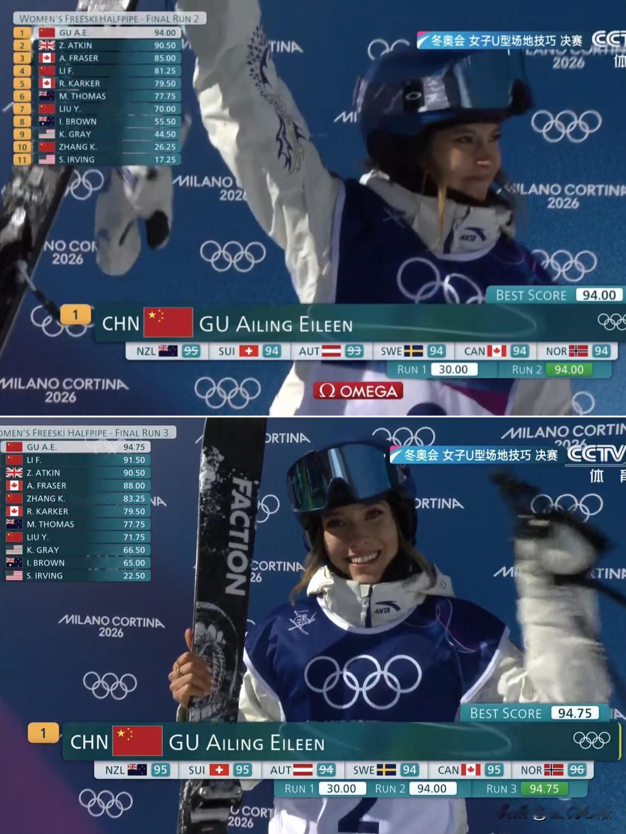 谷爱凌真的太燃了! 拿下米兰冬奥会U型场地技巧金牌🥇 这也是中国代表团的第五金,漂亮收官! 谷爱凌第一轮失误,丝毫没受影响。 第二轮直接飙出94分,稳住局面。 第三轮更厉害,冲到94.75分,直接锁定金牌! 李方慧也超棒,三轮发挥一次比一次好。 最后拿到91.50分,拿下银牌🥈,太争气了! 张可欣前两跳失误,第三跳顶住压力超常发挥。 19岁的刘奕杉第一次参加奥运,全程平稳完成。 四位中国姑娘都超赞,每一个都拼尽全力! 赛场上的不放弃,就是最耀眼的光芒。 为中国滑雪姑娘们骄傲,太牛了!