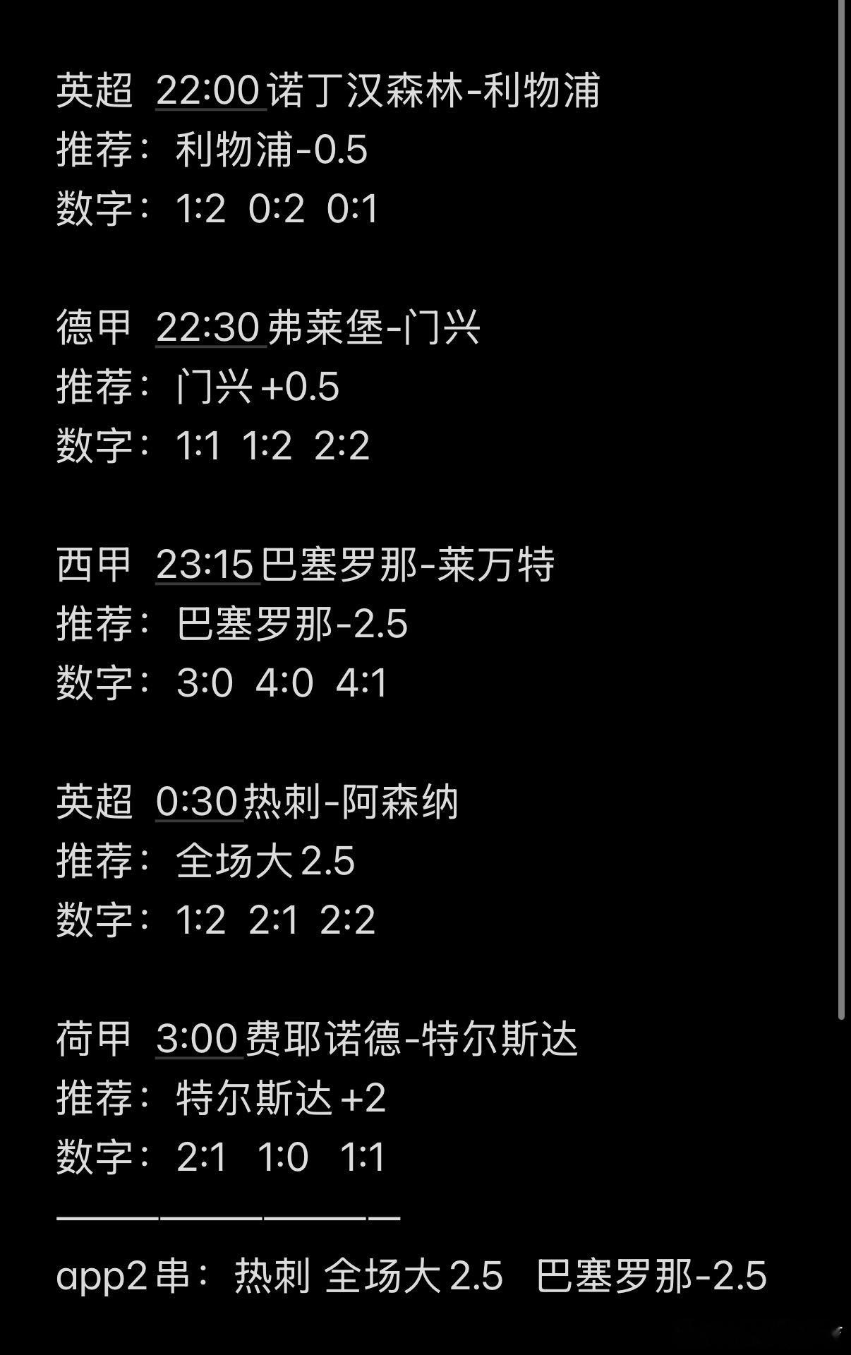 大年初六还是4菜配汤,情况就是这样,赛后见。诺丁汉森林vs利物浦弗莱堡vs门兴巴萨vs莱万特热刺vs阿森纳足球预测
