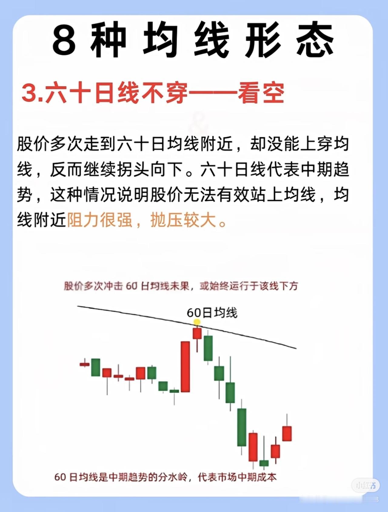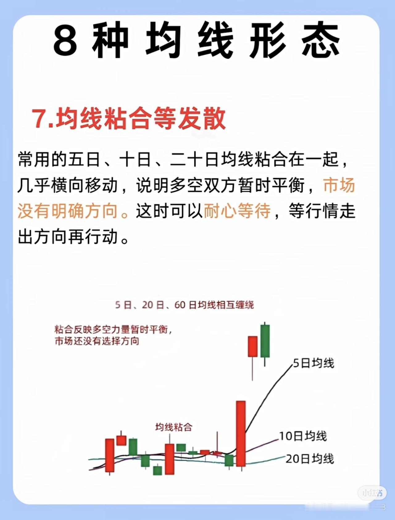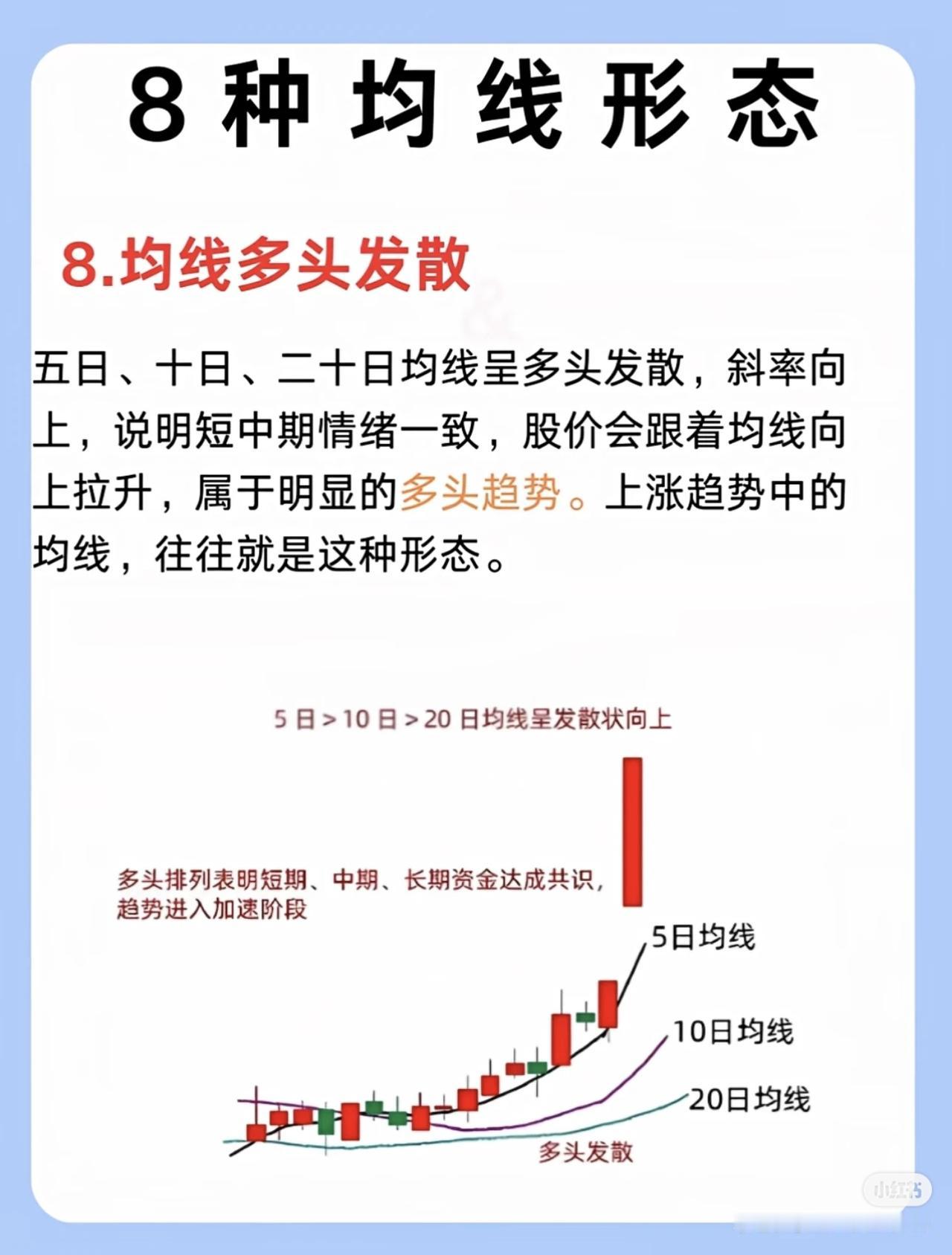 我三年从亏损90%到稳赚460万,核心是死磕掌握了8种关键均线形态,通过均线分析把握买卖点和趋势,大幅提升了投资决策的准确性。 具体来说,这8种均线形态分别是: 1. 五日线不跌破一看多:股价在五日均线上方运行且收盘价未跌破,短期平均成本抬高,强势股常沿五日线上涨,动能未减。 2. 二十日线止跌:股价下跌至二十日线(“生命线”)附近出现长下影或十字星,成交量逐步缩量,抛压减轻、获得支撑,长期上涨股常依托二十日线拉升。 3. 六十日线不穿——看空:股价多次冲击六十日均线(中期趋势分水岭)未果,反而拐头向下,说明阻力强、抛压大,难有效站上均线。 4. 二十日线上穿——等回踩:二十日均线上穿六十日均线形成金叉,随后股价回踩二十日线不跌破,缩量时多为洗盘,支撑强。 5. 线下放量阳——看空:股价在均线下方运行,出现放量阳线却未突破均线,上方压力大,多为短期反弹,整体仍处下跌趋势。 6. 线上缩量阴一看多:股价在均线上方运行,出现缩量阴线(成交量约为上涨阶段三分之一),多为洗盘,大趋势未破坏。 7. 均线粘合等发散:五日、十日、二十日均线粘合横向移动,多空平衡无明确方向,宜等待行情明朗再行动。 8. 均线多头发散:五日、十日、二十日均线呈多头发散且斜率向上,短中期买入情绪一致,预示股价跟随均线向上拉升,属明显多头趋势。 掌握这些形态能帮投资者识别趋势强弱、支撑阻力及主力意图,避免盲目操作,从而提高盈利概率。