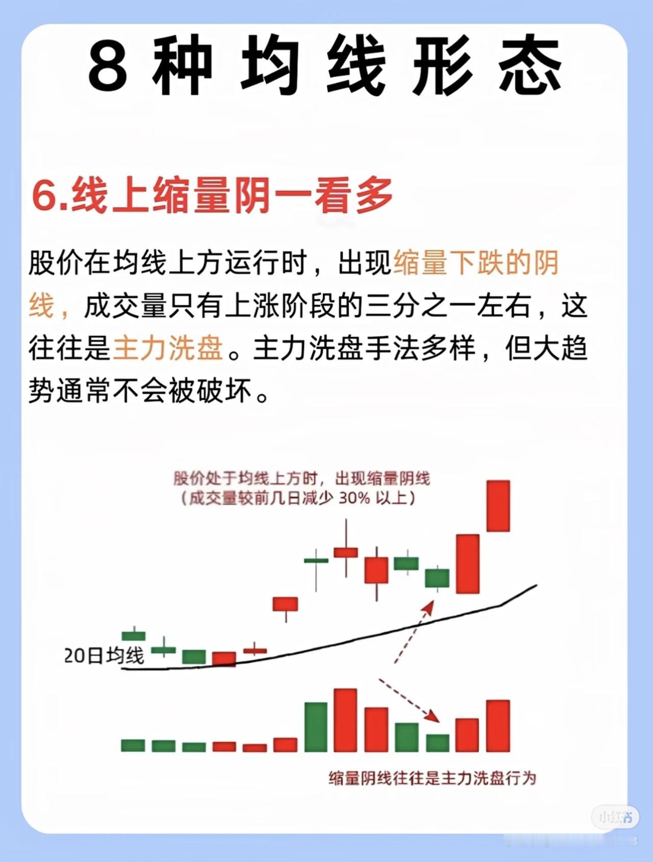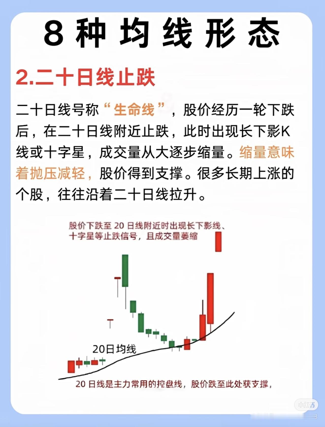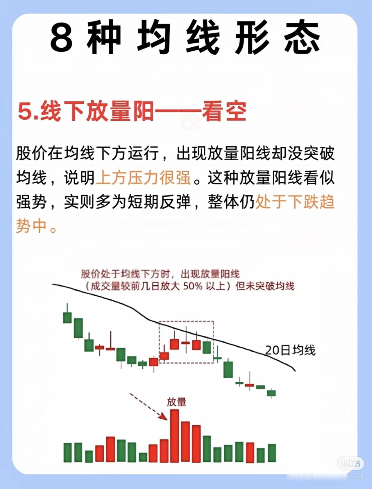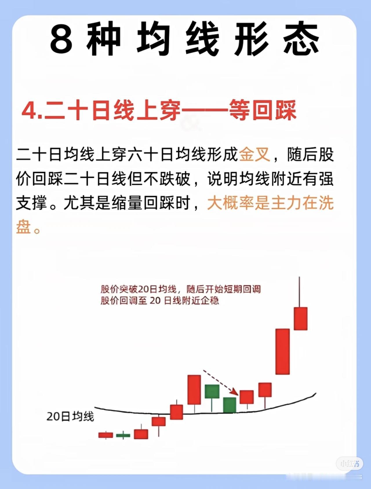我三年从亏损90%到稳赚460万,核心是死磕掌握了8种关键均线形态,通过均线分析把握买卖点和趋势,大幅提升了投资决策的准确性。 具体来说,这8种均线形态分别是: 1. 五日线不跌破一看多:股价在五日均线上方运行且收盘价未跌破,短期平均成本抬高,强势股常沿五日线上涨,动能未减。 2. 二十日线止跌:股价下跌至二十日线(“生命线”)附近出现长下影或十字星,成交量逐步缩量,抛压减轻、获得支撑,长期上涨股常依托二十日线拉升。 3. 六十日线不穿——看空:股价多次冲击六十日均线(中期趋势分水岭)未果,反而拐头向下,说明阻力强、抛压大,难有效站上均线。 4. 二十日线上穿——等回踩:二十日均线上穿六十日均线形成金叉,随后股价回踩二十日线不跌破,缩量时多为洗盘,支撑强。 5. 线下放量阳——看空:股价在均线下方运行,出现放量阳线却未突破均线,上方压力大,多为短期反弹,整体仍处下跌趋势。 6. 线上缩量阴一看多:股价在均线上方运行,出现缩量阴线(成交量约为上涨阶段三分之一),多为洗盘,大趋势未破坏。 7. 均线粘合等发散:五日、十日、二十日均线粘合横向移动,多空平衡无明确方向,宜等待行情明朗再行动。 8. 均线多头发散:五日、十日、二十日均线呈多头发散且斜率向上,短中期买入情绪一致,预示股价跟随均线向上拉升,属明显多头趋势。 掌握这些形态能帮投资者识别趋势强弱、支撑阻力及主力意图,避免盲目操作,从而提高盈利概率。