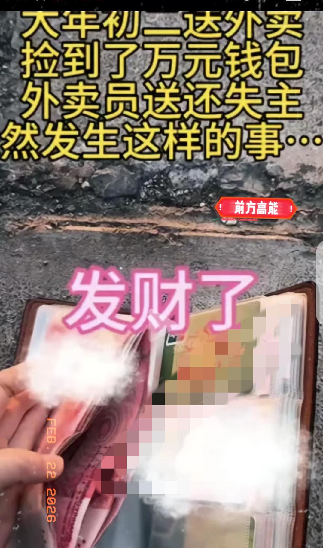 大年初二带娃送外卖的她,捡了万元钱包却分文不取,结局暖哭全网 谁能想到,大年初二本该团圆的日子,一位外卖妈妈正带着年幼的儿子奔波在大街小巷。为了撑起家用,她连春节都没休息,骑着电动车穿梭在街头巷尾,这份坚韧本就让人鼻酸。更让人破防的是,她在路边捡到一个鼓鼓囊囊的钱包,打开一看,竟是一万多元现金,还有身份证、医保卡这些至关重要的证件。 换做旁人,或许会纠结要不要留着,可她第一时间录下视频留证,翻出名片联系失主,还特意绕路把钱包送到失主家门口。面对失主拿出的感谢费,她分文不收,婉拒了吃饭的邀请,只因急着送外卖挣钱,这份不贪小利的本心太珍贵了。 失主被这份善意打动,硬塞给她一盒热气腾腾的饺子,又塞给孩子一个红包,说这是给孩子的压岁钱,这份回赠不是金钱,而是对善良的最高敬意。这哪里是简单的捡钱还钱,分明是寒冬里的双向奔赴。 比起网上那些人性经不起考验的负面新闻,这位外卖妈妈用行动证明,善良从不会缺席。生活虽苦,可人心的温暖总能治愈一切。这样的暖心故事,是不是也戳中了你内心最柔软的地方?你觉得这份双向的善意,算不算马年最好的开局?