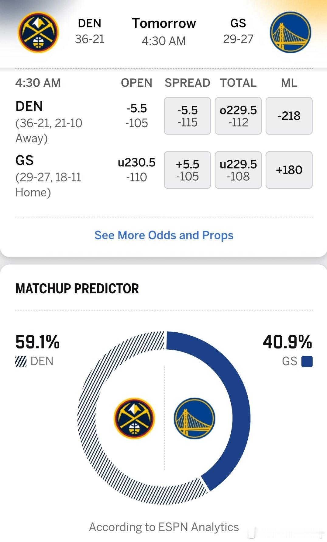 ESPN预测双方胜率:勇士40.9%,掘金59.1%,掘金-5.5分
