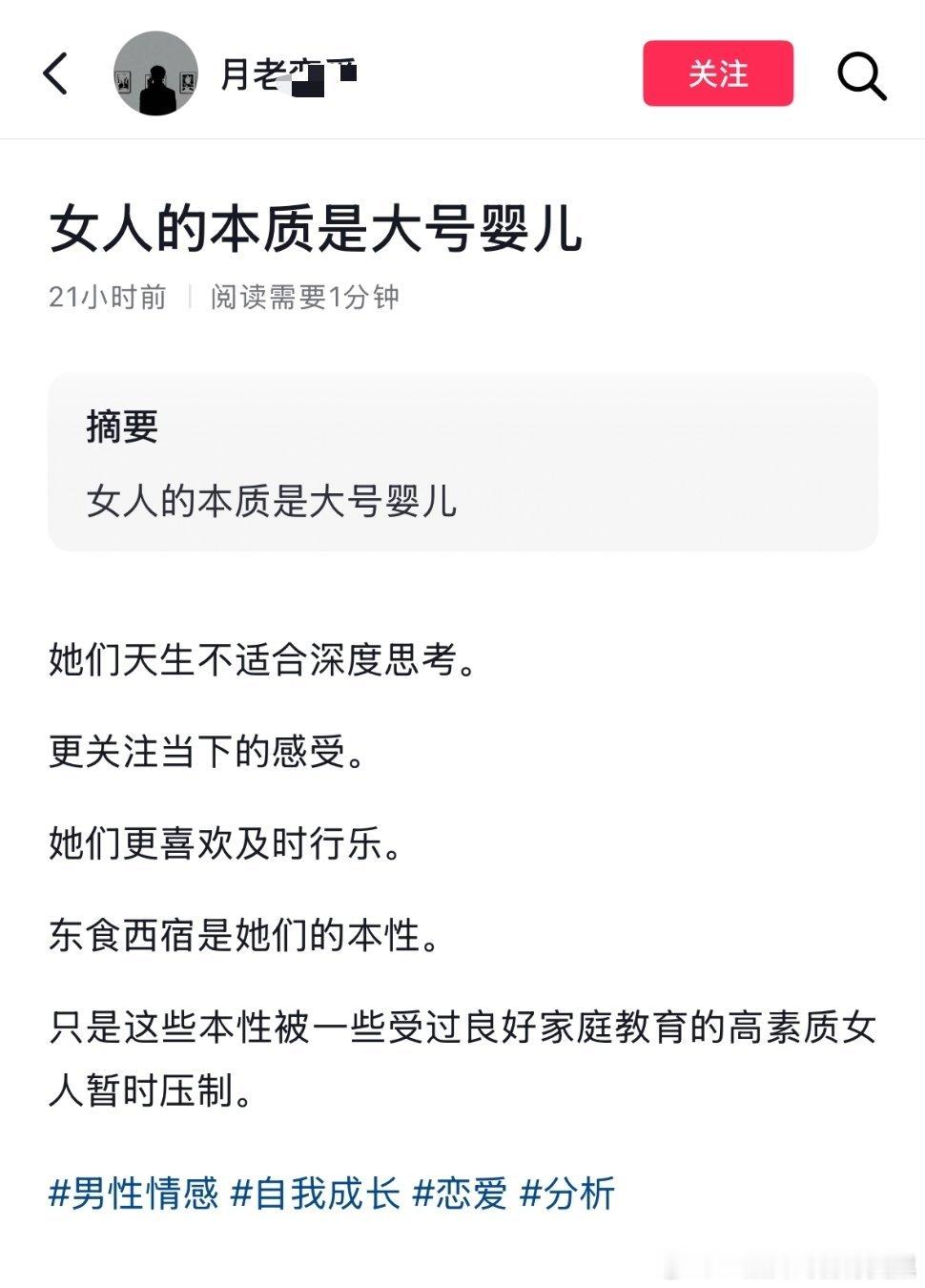 我已经不想再说什么了。浅薄的认知下面还一堆男的吹捧