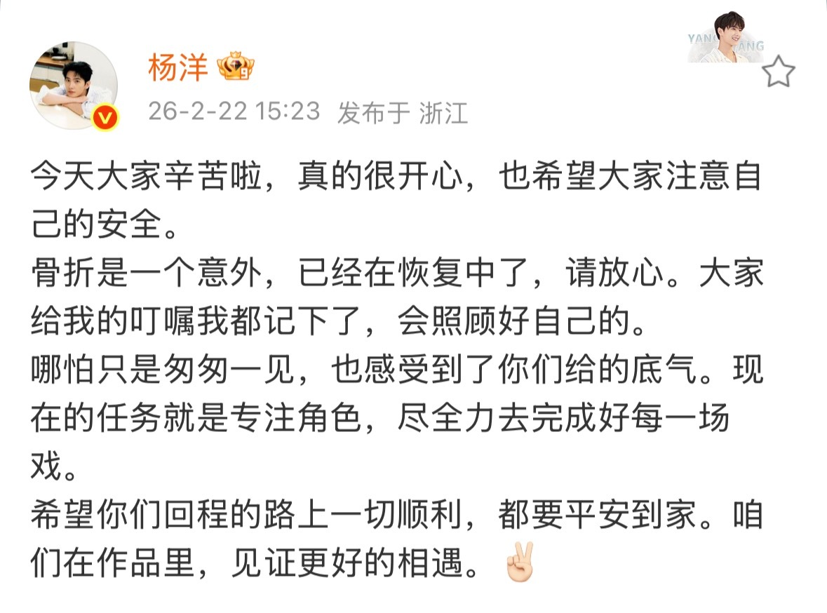 杨洋称骨折是一个意外杨洋说现在的任务就是专注角色 发文,称骨折是一个意外,正在恢复中了,会记住大家的叮嘱,照顾好自己。并表示“现在的任务就是专注角色,尽全力去完成好每一场戏。”