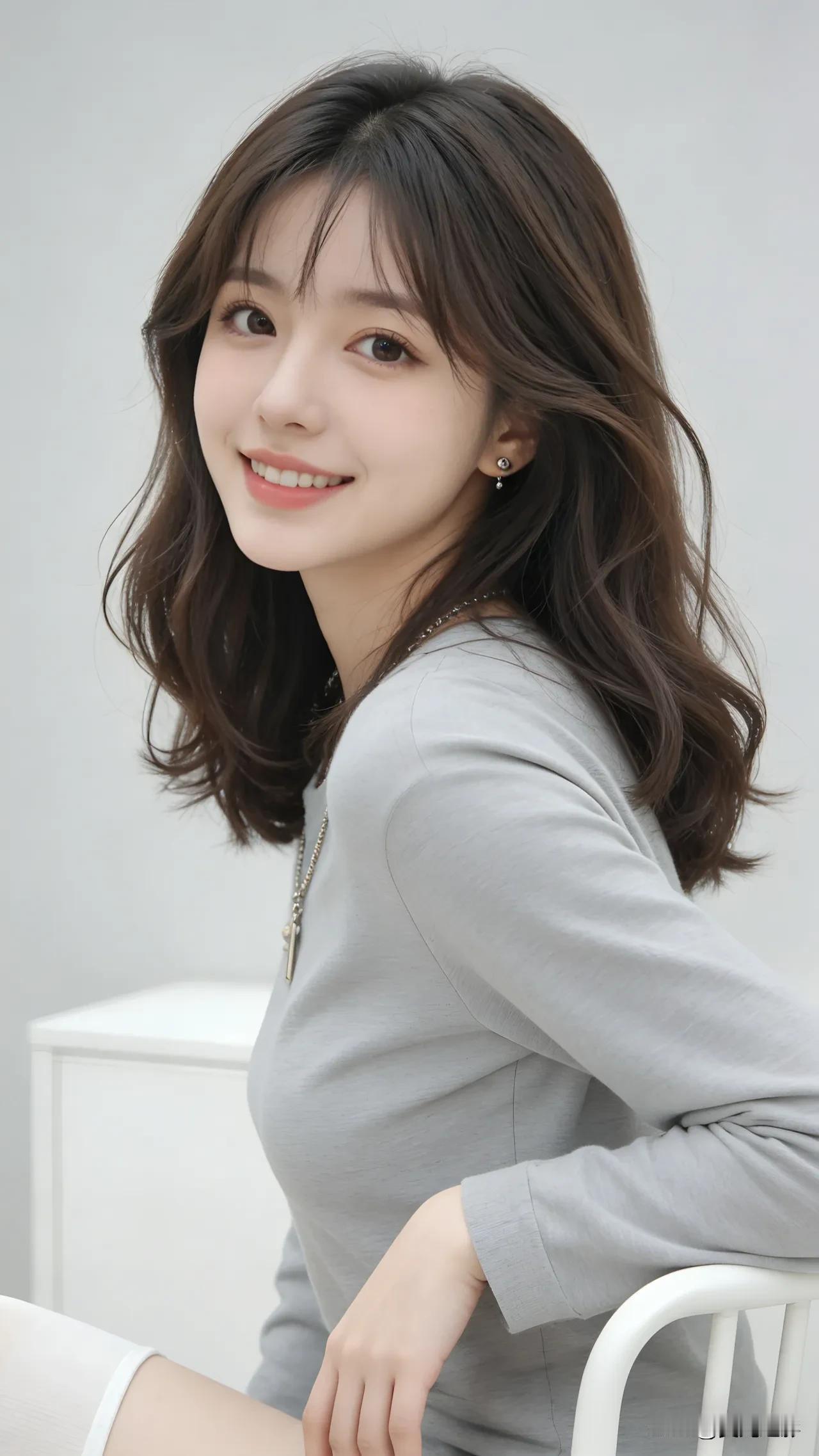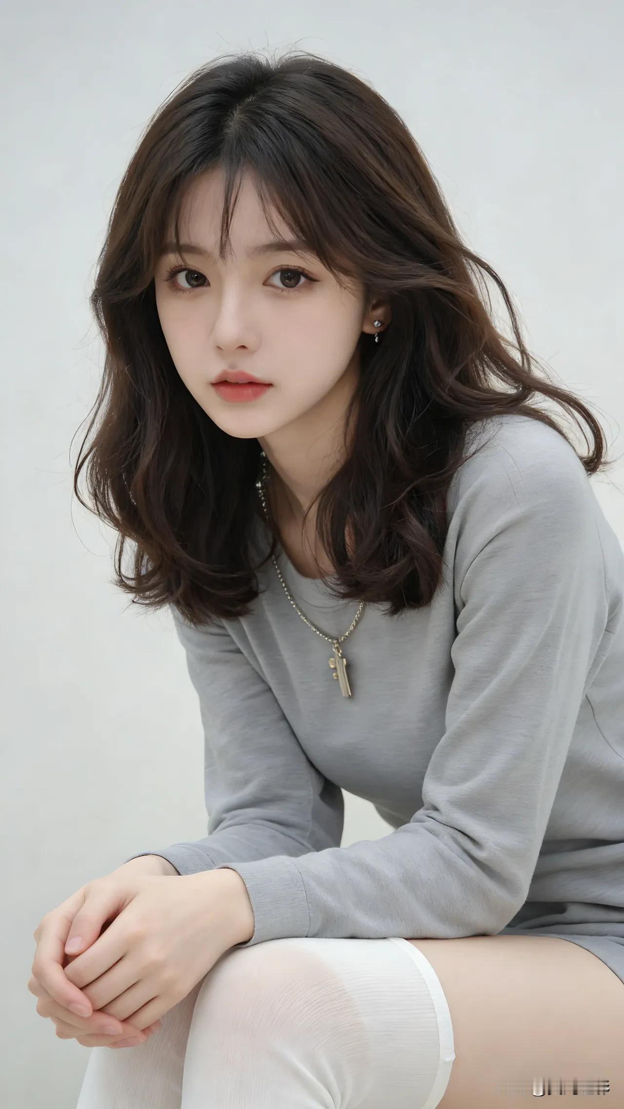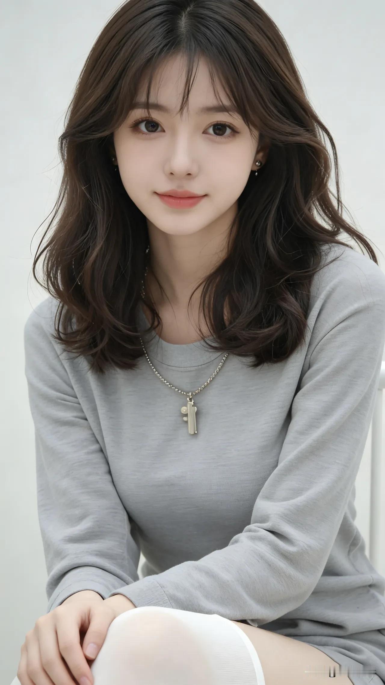 光之影&AI 温柔甜美的少女,浅灰色毛衣搭配白色打底裤,自然卷发,清新动人。 灰色针织穿搭 毛衣女白色