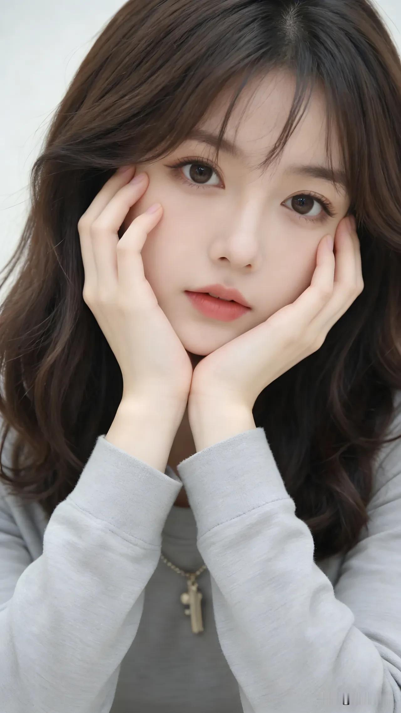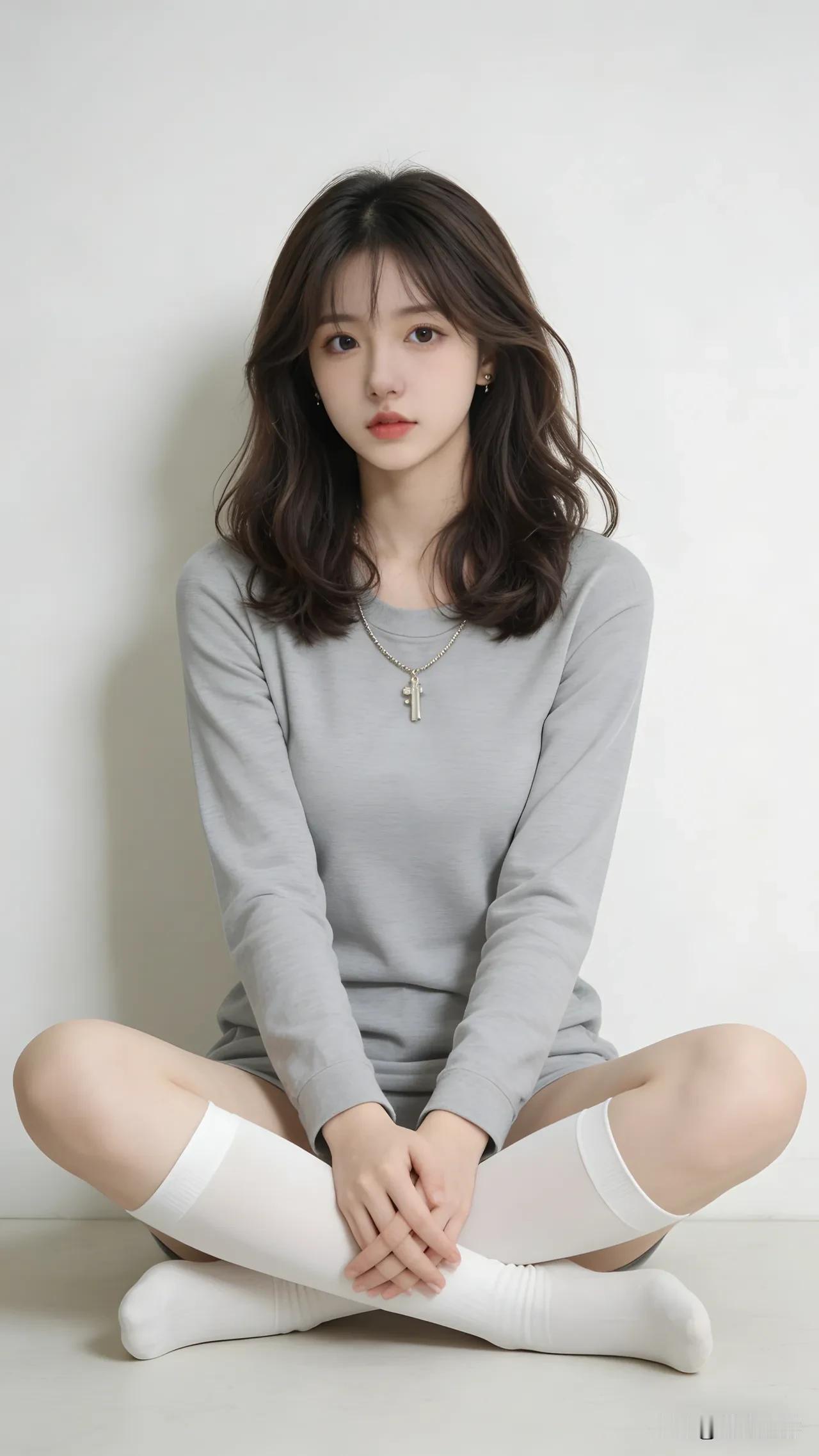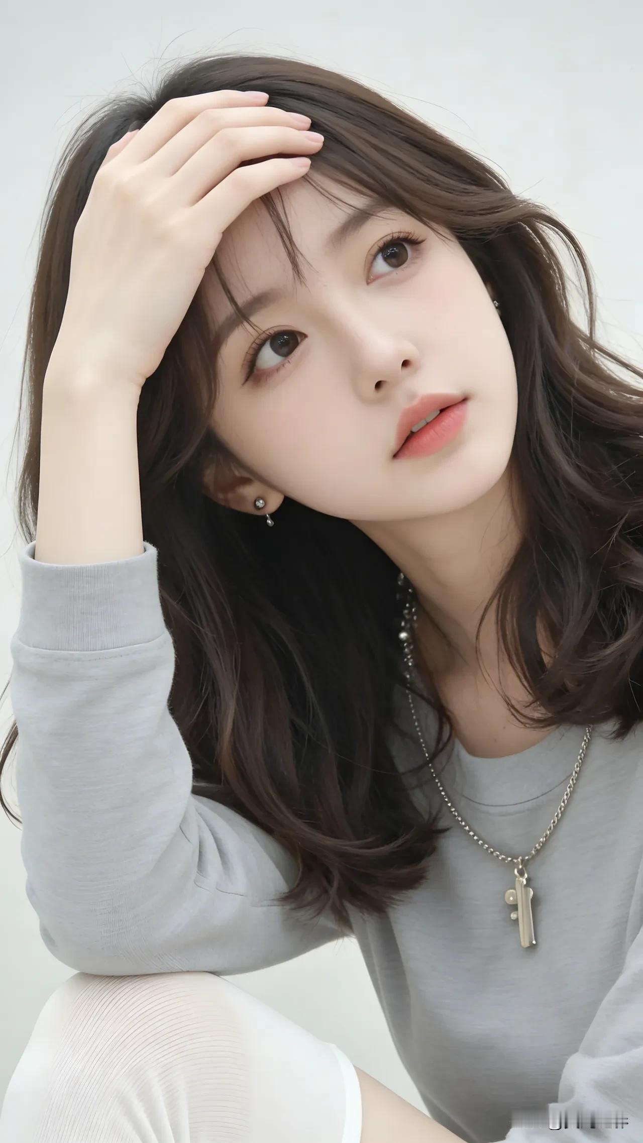 光之影&AI 温柔甜美的少女,浅灰色毛衣搭配白色打底裤,自然卷发,清新动人。 灰色针织穿搭 毛衣女白色