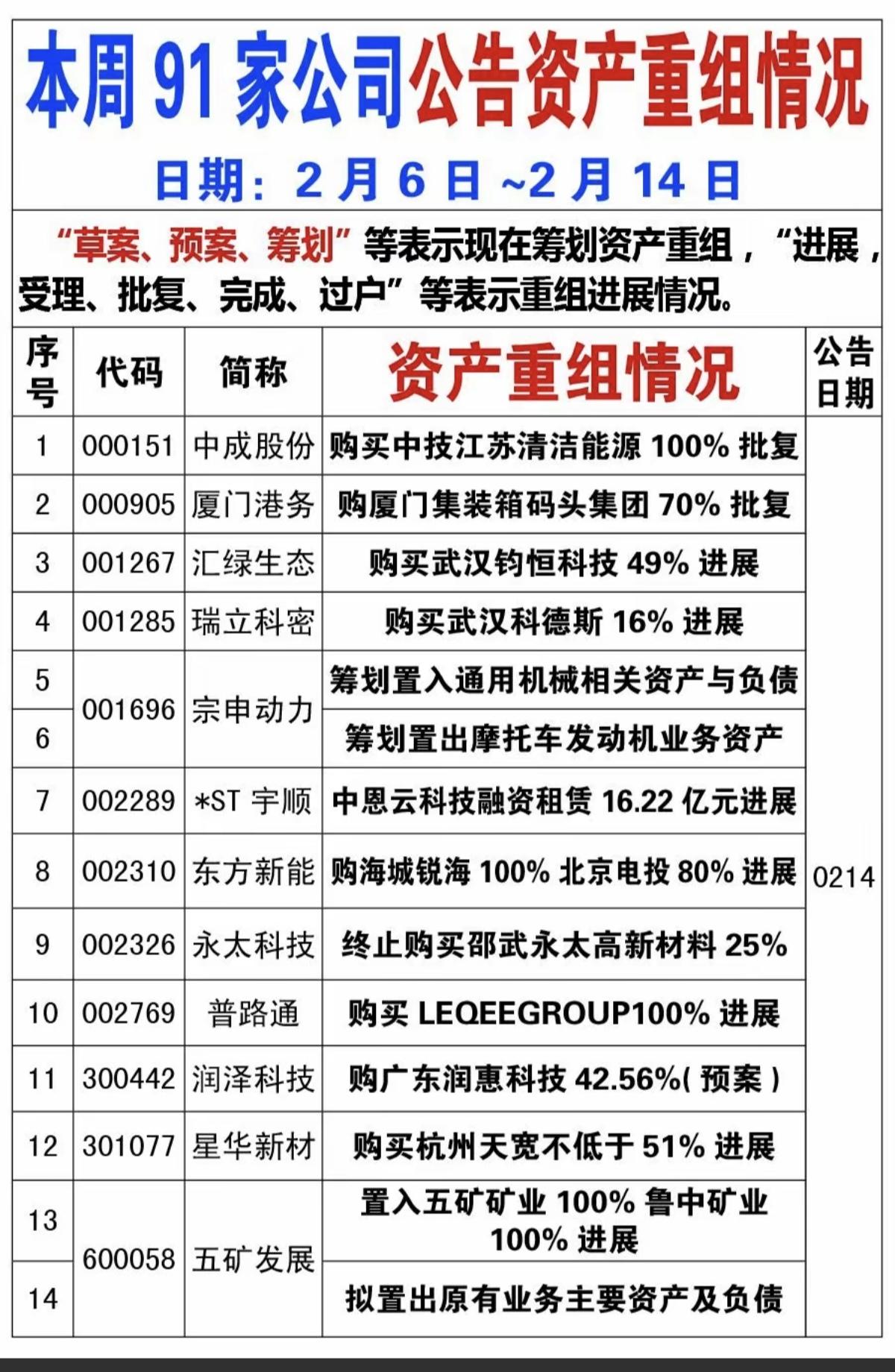 2.22周日 91家公司 资产重组 进展跟踪! 春节期间,累计91公司公告资产重组情况,进展跟踪。 资产重组股,做大做强,里面可以寻找一定的投资机会。