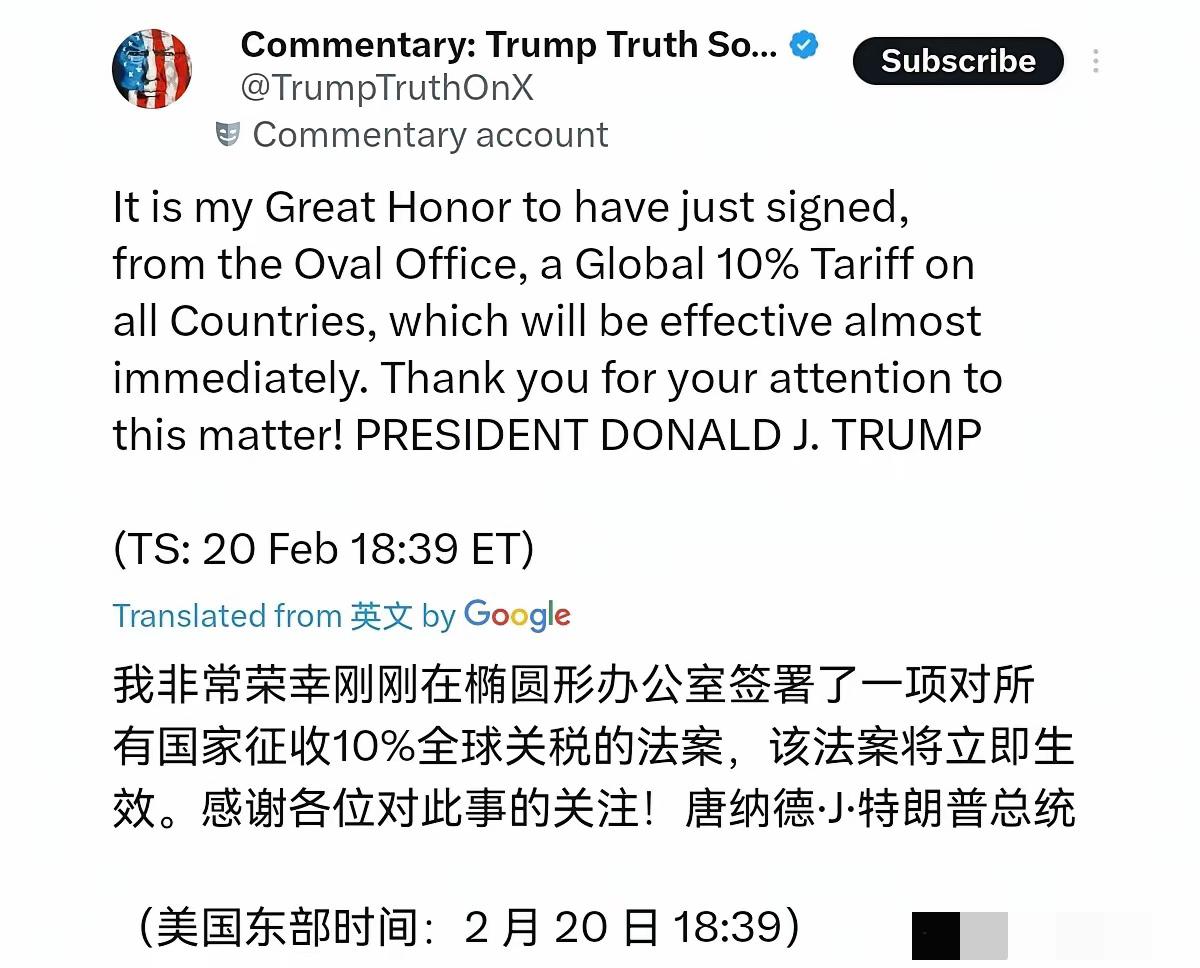 美国的一巴掌,扇晕了刚刚与美国达成协议的高市早苗!2月21日,特朗普声称,我非常荣幸地刚刚在椭圆形办公室签署了一项对所有国家征收10%全球关税的法案,该法案几乎将立即生效。感谢您对此事的关注!很显然,特朗普的这一宣布,说明什么呢?这充分说明一点,单方面对美国妥协,对美国大让步换取的协议,美国说废弃就废弃。 高市早苗这边刚把价值5500亿美元的“投名状”递上去,那边特朗普反手就甩出一张“全球10%关税”的王炸。这哪是打脸,这是直接把日本按在地上摩擦。高市早苗估计现在脑瓜子嗡嗡的,心里一万个问号:不是说好了是“最亲密的盟友”吗?怎么连盟友的钱也照抢不误? 特朗普这一招,玩的就是“无差别攻击”。管你是敌人还是小弟,只要想进美国市场,先交10%的“过路费”。这摆明了就是告诉全世界:在我特朗普眼里,没有永远的盟友,只有永远的利益。日本那点小心思,想靠砸钱买平安?门都没有!美国要的是真金白银,不是虚头巴脑的“友谊”。 高市早苗这次算是栽了个大跟头。她以为抱紧美国大腿就能高枕无忧,结果发现美国的大腿不仅粗,还带刺。这下好了,不仅没捞到好处,反而被狠狠宰了一刀。这波操作,真是赔了夫人又折兵。 各位读者你们怎么看?欢迎在评论区讨论。
