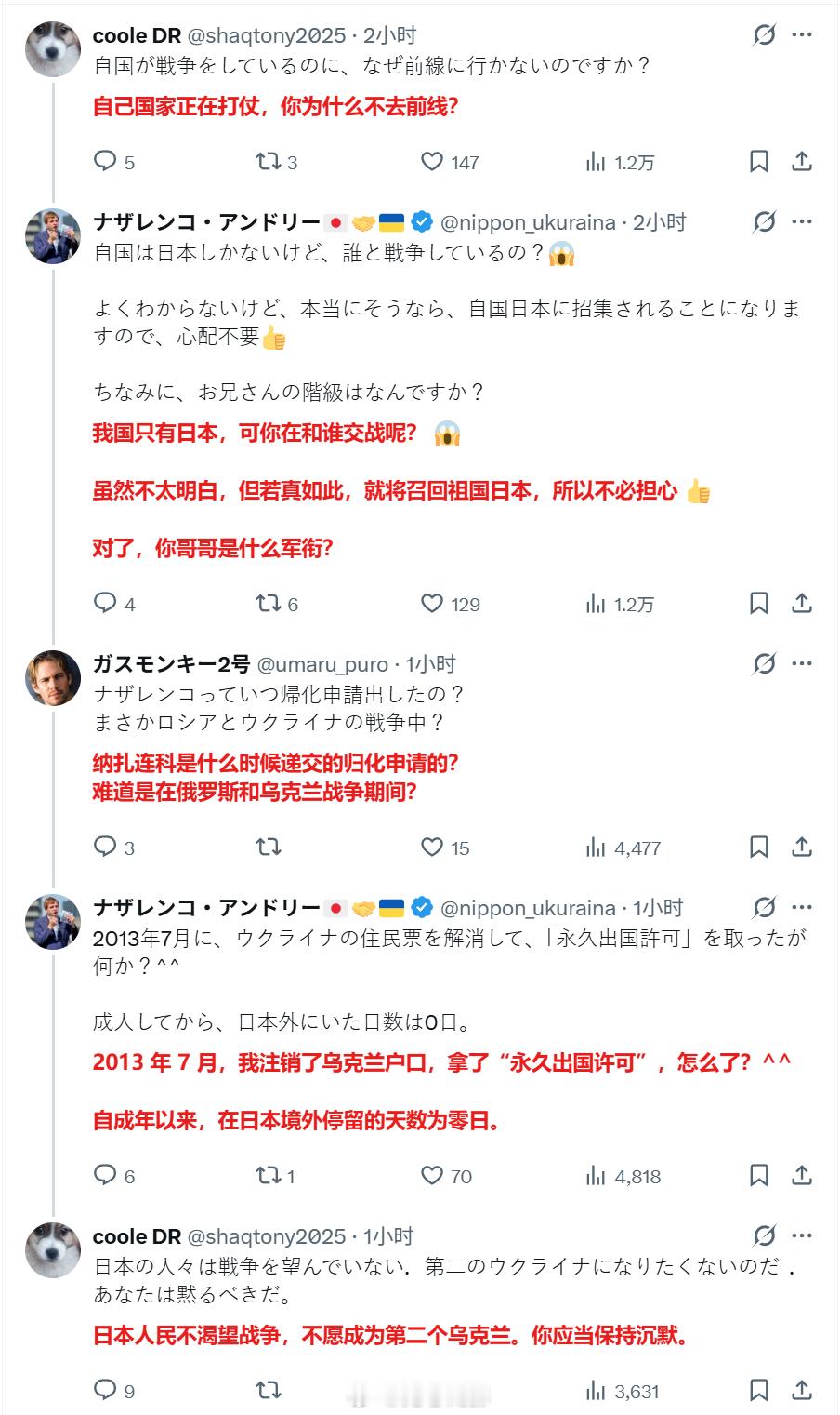 一个乌克兰人,在日本申请加入自卫队预备役,要为了“台湾有事就是日本有事”而战。人们问他为什么不回乌克兰去打仗,他说他2013年就注销乌克兰国籍了。但又有人质问,注销国籍和申请在日本归化是两回事,没见他申请过归化日本啊。他就不说话了……