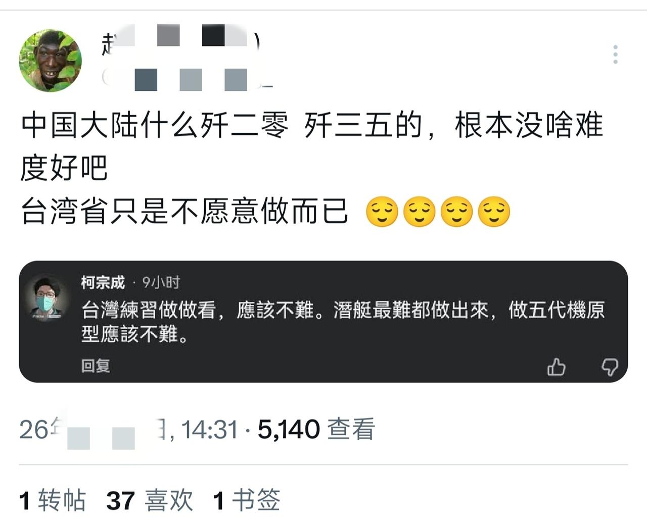 台湾绿蛙说, 潜艇最难做,台湾都做得出来, 五代机啥的应该不难,也能做出来。[捂