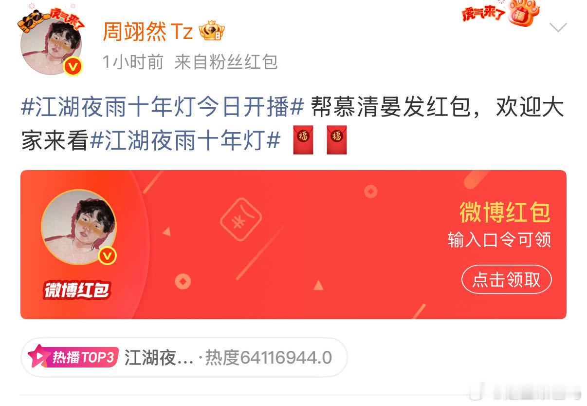 周翊然周翊然春节发了10万红包周翊然 红包博主周翊然红包博主!!欢迎大家来看《江湖夜雨十年灯》,算除夕夜和大年初一发的红包,春节已发了10万红包。