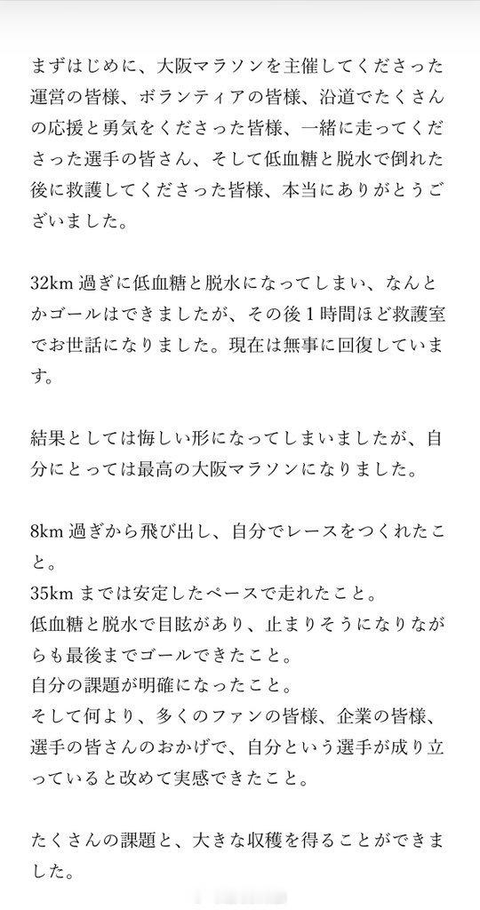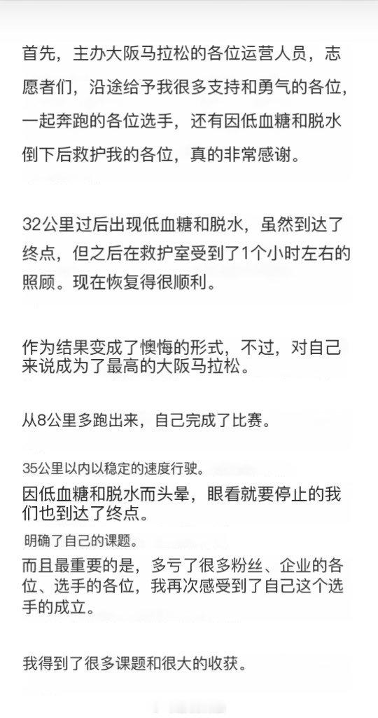 2026大阪马拉松中,吉田响以一种那塞门托 网页链接 般的自杀式领跑方式让全球爱好者关注到了他。赛后他的总结是32公里处出现低血糖和脱水状况,赛后不得不接受了一小时的医疗救助。好在最终恢复良好,这也给马拉松新手上了很好的一课吧。