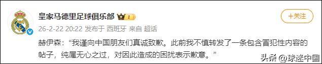 昨晚,皇马后卫赫伊森在社媒转发辱华内容。团队解释是“误触”,但这借口比他在场上的冒顶还业余。那条动态来自专门发布歧视内容的韩语小号,手指要多么精准才能“误触”到这种垃圾? 讽刺的是,皇马48小时前还高调反歧视,轮到自己人辱华就变成“无心之过”。反歧视在伯纳乌,难道也分三六九等? 更恶心的是后续操作:赫伊森至今未在外网道歉,仅通过皇马官微发中文声明。这是典型的“分区道歉”,把中国球迷当傻子糊弄。 一边赚着中国市场的钱,一边转发辱华梗,这是典型的“吃饭砸锅”。足球可以输,但尊严不能丢。 赫伊森,这次你防不住的不是前锋,是你自己的人性。