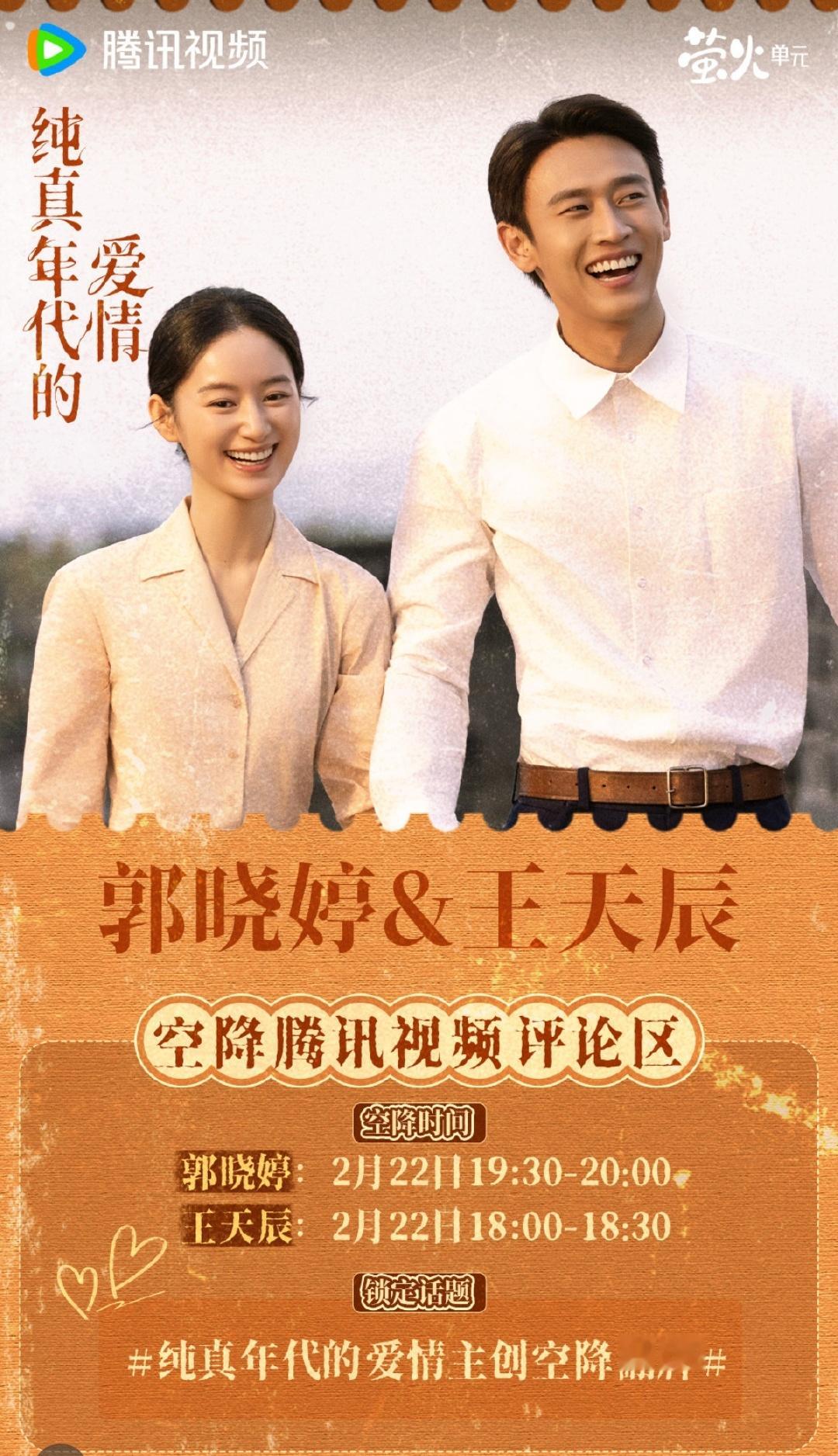 纯真年代的爱情(腾讯视频+央八播出)2月21日19:30开播,由陈飞宇、孙千领衔主演,郭晓婷、王天辰特别主演,刘敏涛特邀出演,吴樾 、郝文婷 、侯长荣、孔琳特别出演。改编自小说《实用主义者的爱情》。