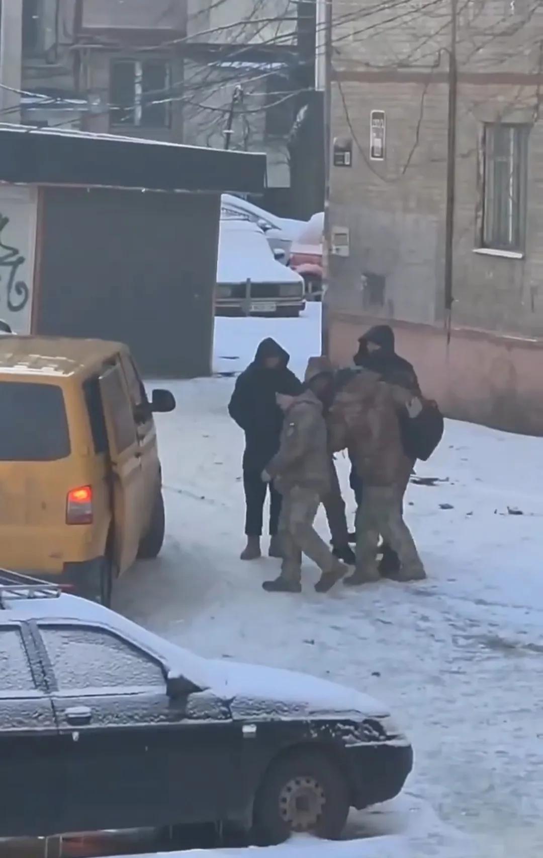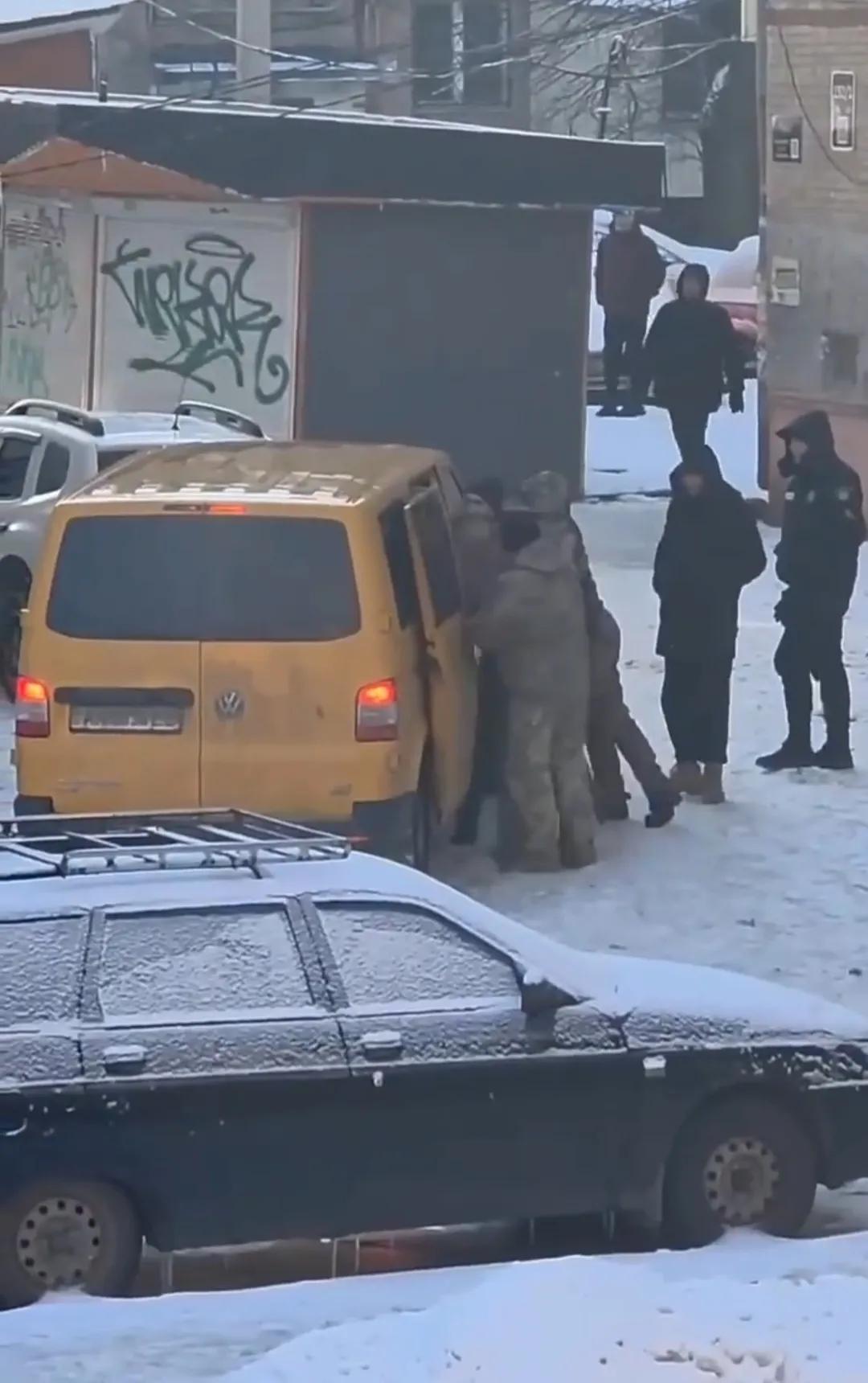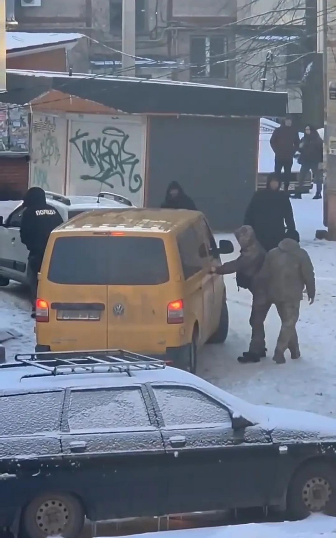 乌克兰哈尔科夫州首府哈尔科夫市的早上,一名成年男性在大街上被征兵办(TCC)的几名人员堵住了。没说几句话,TCC人员就把这名成年男性强行塞进了黄色面包车里,随后扬长而去。