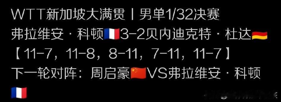 WTT,新加坡大满贯赛的赛场上,我们除了关注国乒球员的场上表现之外,一些主要对手,包括一些潜在的能力提升比较明显的外协会高手的表现,也同样吸引球迷的关注目光,结果在一场法国小将,潜力派新星科顿和德国名将杜达的正面交锋当中,小将科顿是展现出了极佳的竞技状态,也把握好了关键分,以3:2的总比分险胜杜达,锁定一个男单32强的席位。双方五局的具体比分是11:7、11:8、8:11、7:11和11:7。 而科顿的下一轮对手,则将是国乒老将,出生于1997年的实力派代表周启豪。周启豪也是在首轮面对来自非洲的一哥阿鲁纳的比拼过程中,丢掉一局的情况下,以3:1的比分战胜对手,锁定一张32强的门票的。 事实上科顿本身年纪小,不满18岁,打法上还有一些欠缺,但是这位小将拼劲十足,个人特点突出,而且进攻能力强,场上一旦能把比赛拖入自己的节奏,对方就很难在他身上占到便宜。这次能参加新加坡大满贯赛,而且在世界排名前20行列的杜达面前还能赢球,就证明了科顿的比赛能力。 当然,科顿这位小将之所以在中国球迷当中有一定的认知度,很大程度上是源于他在世界赛场曾非常轻松的战胜中国名将徐瑛彬,也算是用那样的一种方式得到了球迷的认可。让我们记住了他的名字和他那张稚嫩的面孔。 尽管科顿也具备较强竞争力,而且场上拼劲十足,但是相信只要周启豪自己不犯大的错误,出现大的问题,在下一轮比拼当中周启豪还是更有机会在科顿面前胜出,并锁定一个男单16强席位的,您觉得呢?