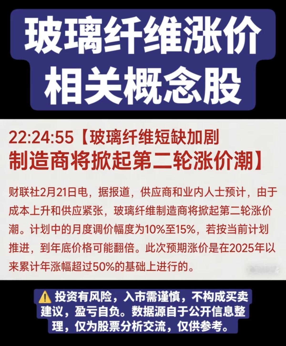 玻璃纤维短缺加剧!第二轮涨价潮来袭! 由于成本上升和供应短缺,制造商将掀起第二轮涨价潮,计划调价幅度10~15%,按照此涨幅,饭年底可能价格翻倍。 相关核心龙头受益股: