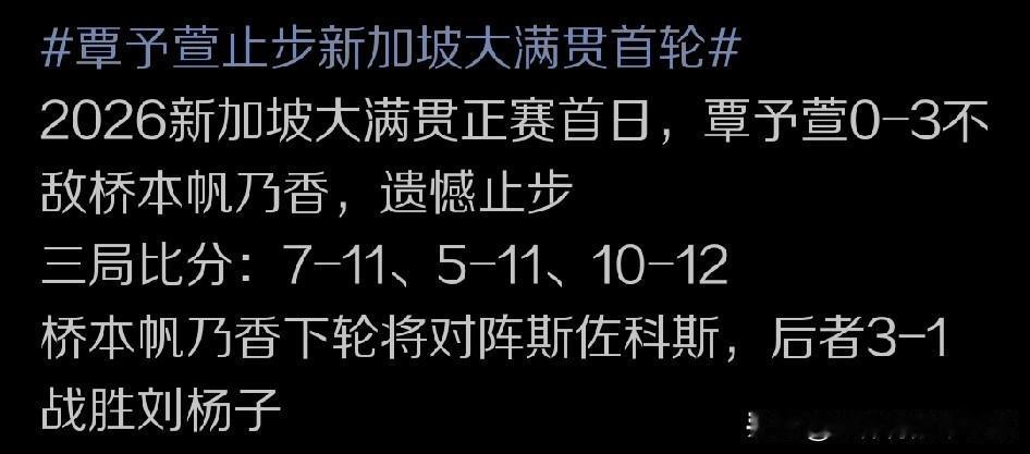 新加坡大满贯赛的比赛场上,我们对年轻的国乒小将覃予萱能在正赛当中有机会出战,可以说充满期待,这种潜力派国乒小花能在这种世界顶级的商业赛事当中出场,并与各路真正的高手对决,本身对他们来说是很大的挑战的基础上,更是他们提升自己的好机会。 比如这次比赛首轮覃予萱面对来自日本的削球名将桥本帆乃香尽管打的积极主动,也很想全力表现自己。但显然她应对削球方面的能力还是稍显不足,这也让覃予萱三局比赛无一胜绩,直接0:3遭遇一场完败,输给桥本帆乃香的同时,送对方一个晋级32强的名额,同时自己也止步64强。 而桥本帆乃香在拿到比赛胜利之后,下轮就将迎来和罗马尼亚美女球员斯佐科斯正面交锋的机会,斯佐科斯是在3:1战胜来自澳大利亚的刘杨子后,锁定一个女单的32强席位的。 值得一提的是,斯佐科斯本身的综合作战能力也比较强,所以对于桥本帆乃香来讲,她将面临很大的挑战。不过如果桥本帆乃香能够翻过斯佐科斯这座大山,下一轮她就极可能会和同样大概率能晋级16强的国乒新生代中的代表角色陈熠迎来正面交锋。 对于陈熠来说,她也确实需要在桥本帆乃香这种主要对手,还是削球对手面前有所发挥,用这种硬仗当中的胜利来为自己争取一个国乒女队当中的关键位置。只有在这种关键对手面前竞争力持续提升,才是我们真正期待看到的不是吗?