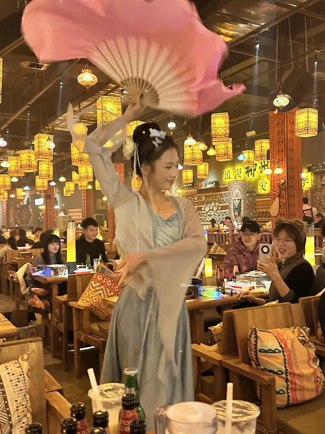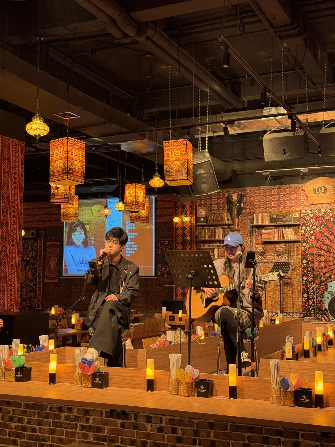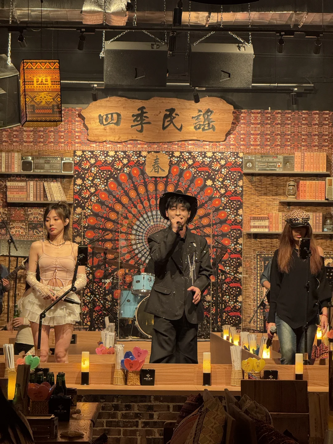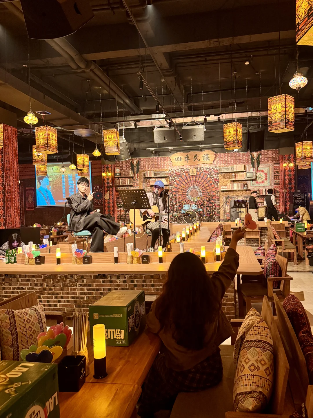 和朋友九点多到的,人已经蛮多了! 正好赶上现场驻唱 吉他弹唱+温柔嗓音,每一首都是大合唱的节奏 没想到竟然还有国风舞蹈表演,跳舞的小姐姐好美 -