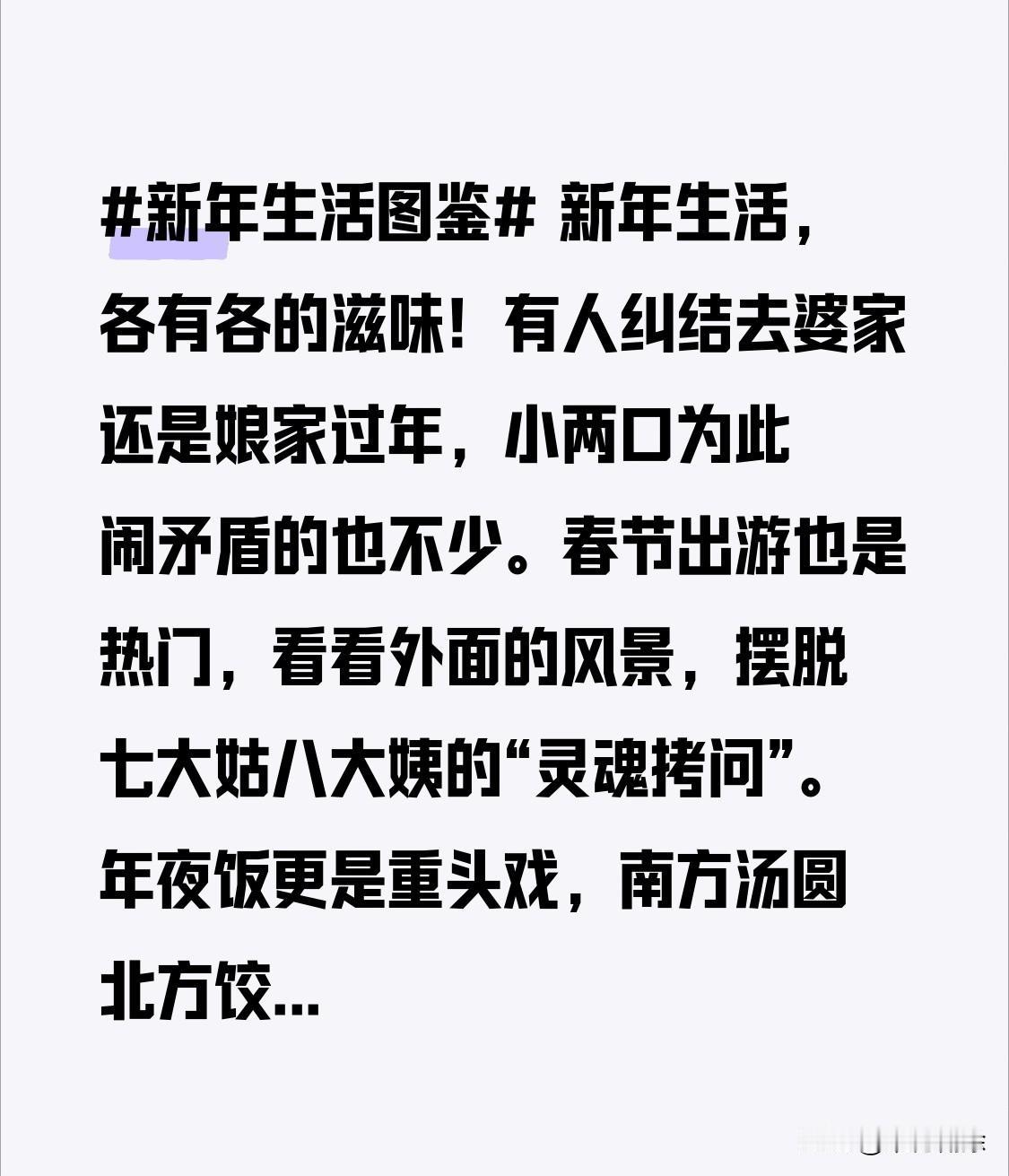 新年生活,各有各的滋味!有人纠结去婆家还是娘家过年,小两口为此闹矛盾的也不少。春节出游也是热门,看看外面的风景,摆脱七大姑八大姨的“灵魂拷问”。年夜饭更是重头戏,南方汤圆北方饺子,烟火气满满。过年开销也让人头疼,红包给多少成了难题。这就是咱接地气的新年生活!
