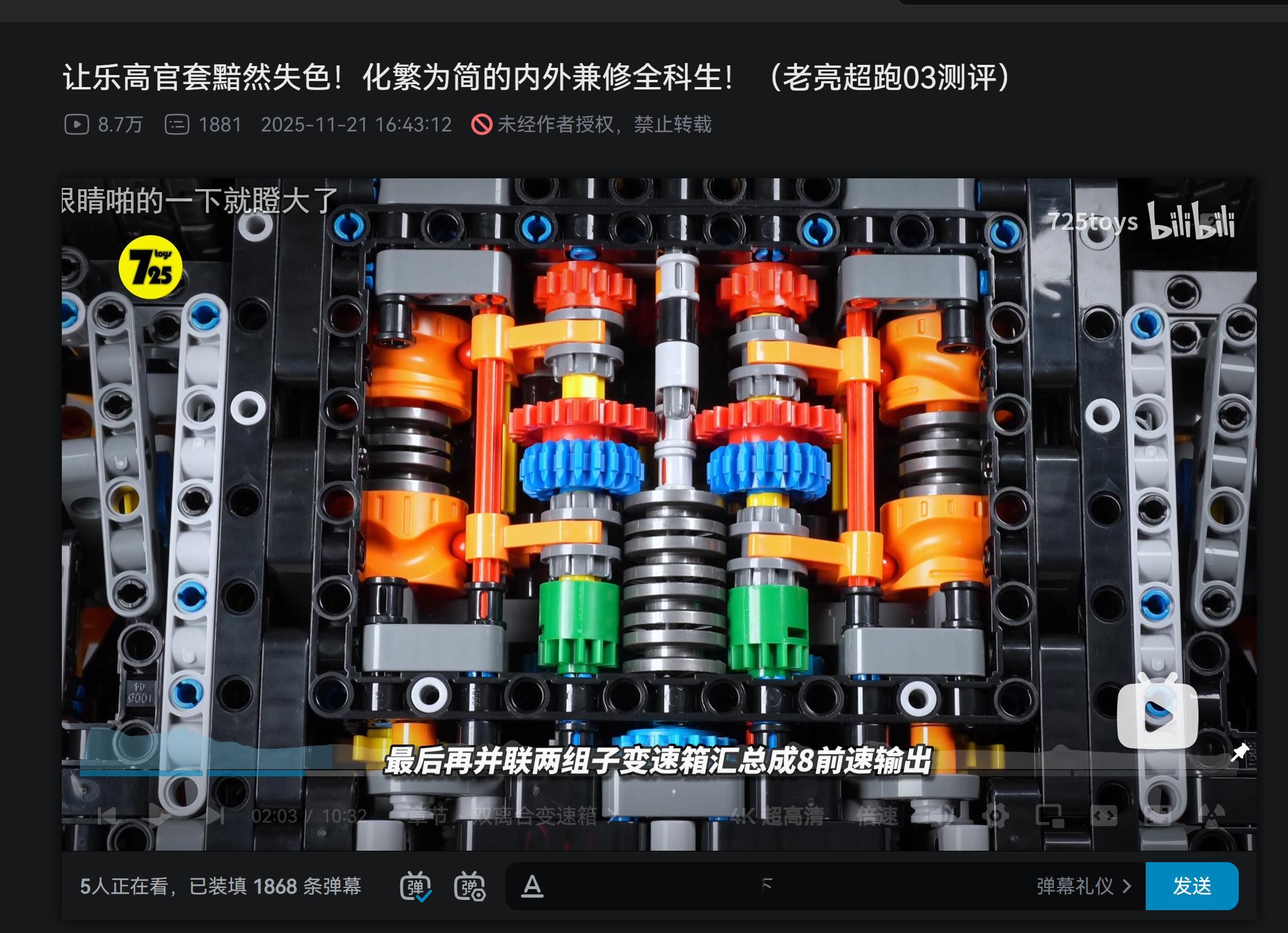 这个超跑03最大卖点是这个变速箱了,设计是很牛,但耐不住零件生产质量不行导致换挡经常卡档,就连这个视频一边在说“换挡成功率极高”一边就是2:03画面里这个动力传输环就发生了抵持进不去,客服自己也说是一方面3代变速箱天生的底层BUG,另一方面是国产零件发生抵持的地方不如乐高的圆润导致卡档概率更大