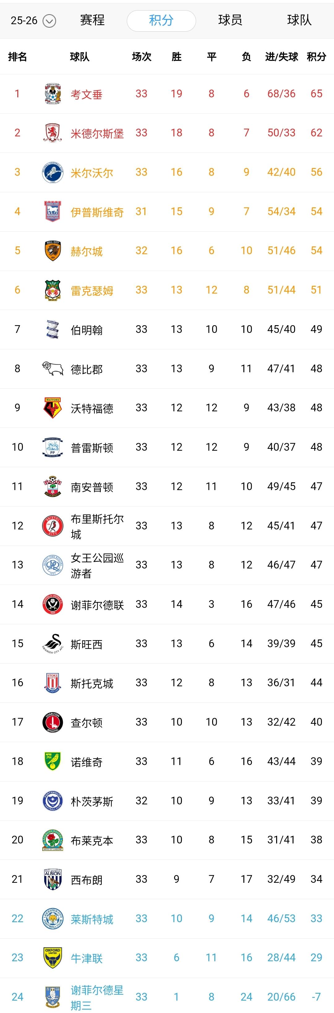 英冠神剧情!经历了一波低谷的考文垂复活了,两连胜后跟第三名的差距拉大到9分。 除了自身努力,还得感谢后面的兄弟神助攻。排名第二的米德尔斯堡被保级队逼平、第三第四第五同时输球,只有第六的雷克瑟姆大胜。 谢菲尔德联2-1险胜谢周三,谢周三提前13轮降级,谢菲尔德联距离附加赛区仅仅6分,这已经非常不错了。想想赛季初它输了多少场。 保级区的莱斯特城、牛津联虽然都未能取胜,但距离第17名仅仅1分和4分而已。
