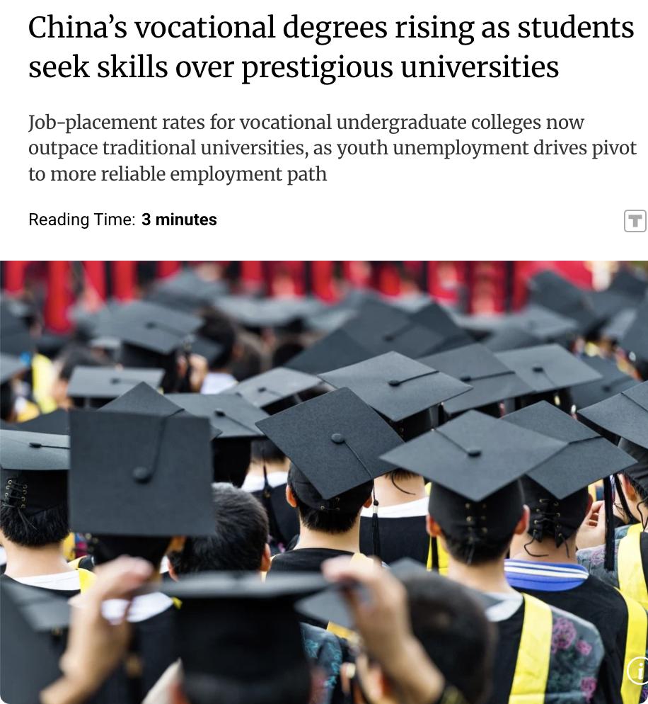 外媒:中国职业本科升温:就业率超传统高校,成部分高分生主动选择 在传统大学毕业生供过于求的背景下,中国职业本科教育正从"备选项"转变为部分学生的主动战略选择。来自广东阳江的考生林刚明去年以可入读顶尖高校的成绩,主动选择了深圳职业技术大学,此类案例已被国内媒体频繁报道。 职业本科院校同样授予学士学位,但课程聚焦于技术技能培养,毕业生就业率目前已超越传统本科院校。机构规模扩张迅猛——从2019年试点阶段的仅15所,增至如今逾100所。 香港大学中国教育研究专家杰拉德·波斯蒂利奥内指出,此次调整是中国应对经济多元化与技术加速发展的主动回应,方向是将学术教育与职业技术教育融合,而非割裂。