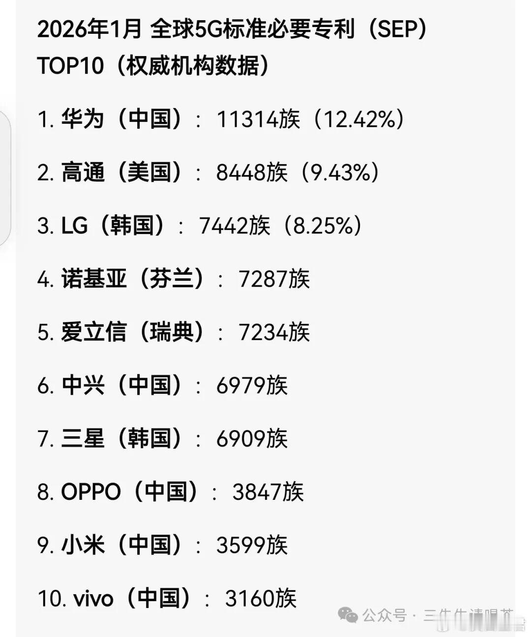 这是全球5G标准必要专利排行,其中华为11314族专利,占比12.42%,遥遥领先!首先什么是“族”,内容一样、只是注册国家不同的一堆专利,只算 1 个专利族,这是行业最公平、最权威的统计口径。也是为了防止一些滑头擅长搞小动作的企业,拿着一个专利在全世界大范围的注册很多个专利,那么这些不同国家注册的相同专利只能算一个专利族!我们可以看到,华为在5G专利上是绝对的领先!至于为什么华为专利最多,自己的手机却不能支持不能显示5G,我之前的视频做过解读。简而言之,是因为咱们国产供应链没有跟上华为研发的步伐,华为设计的出来,研发的出来,但是因为制裁的原因,一些设备、工艺的限制,咱们国内的供应商制造不出来一些关键的零部件。其实和全球所有的手机厂商都能够买到3nm芯片,但是华为却只能搞自主可控的等效5nm甚至7nm的原因一样。有专利能设计,但是因为国内供应链的短板没有补齐,暂时还没有搞定关键零部件的生产制造环节。所以,华为没有标5G,不是华为的耻辱,其实是咱们国产高端制造、产业链的耻辱;而华为带着一众供应链逐步突破制裁和封锁,恰恰证明了华为确实是国产高科技的中流砥柱!与之相反,每年要给高通、华为上交专利费的一些友商,坐享其成,花钱买专利,才应该是值得反思的角色,你们说呢?