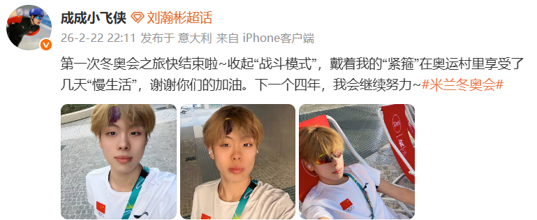 #速滑齐天大圣赛场外另一面##刘瀚彬冬奥村慢生活# 刘瀚彬发博晒图:第一次冬奥会之旅快结束啦~收起“战斗模式”,戴着我的“紧箍”在奥运村里享受了几天“慢生活”,谢谢你们的加油。下一个四年,我会继续努力~#看冬奥上咪咕#