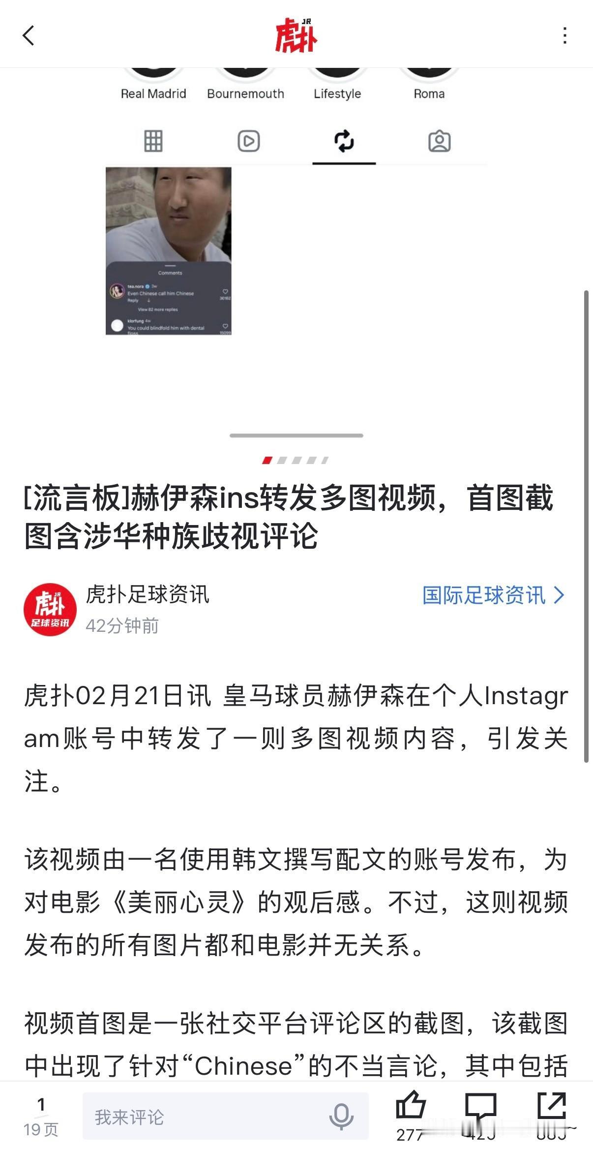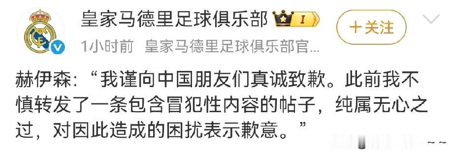 我去! 就是赫伊森这个“小鬼”惹的祸? 我看皇家马德里俱乐部有他的致歉信了,理由倒是挺会找的,还无心之过呢。 我看你要把皇家马德里俱乐部给毁了。 你有啥能耐呀?1米9的大个子,比赛上不了几场,跟玻璃人一样,老是受伤,防守防守不行,移动速度又这么慢…这是闲着没事干,天天拿着手机上网惹祸了。 道歉是没用的!皇家马德里拿出态度来,按照国际惯例该处罚的处罚吧?