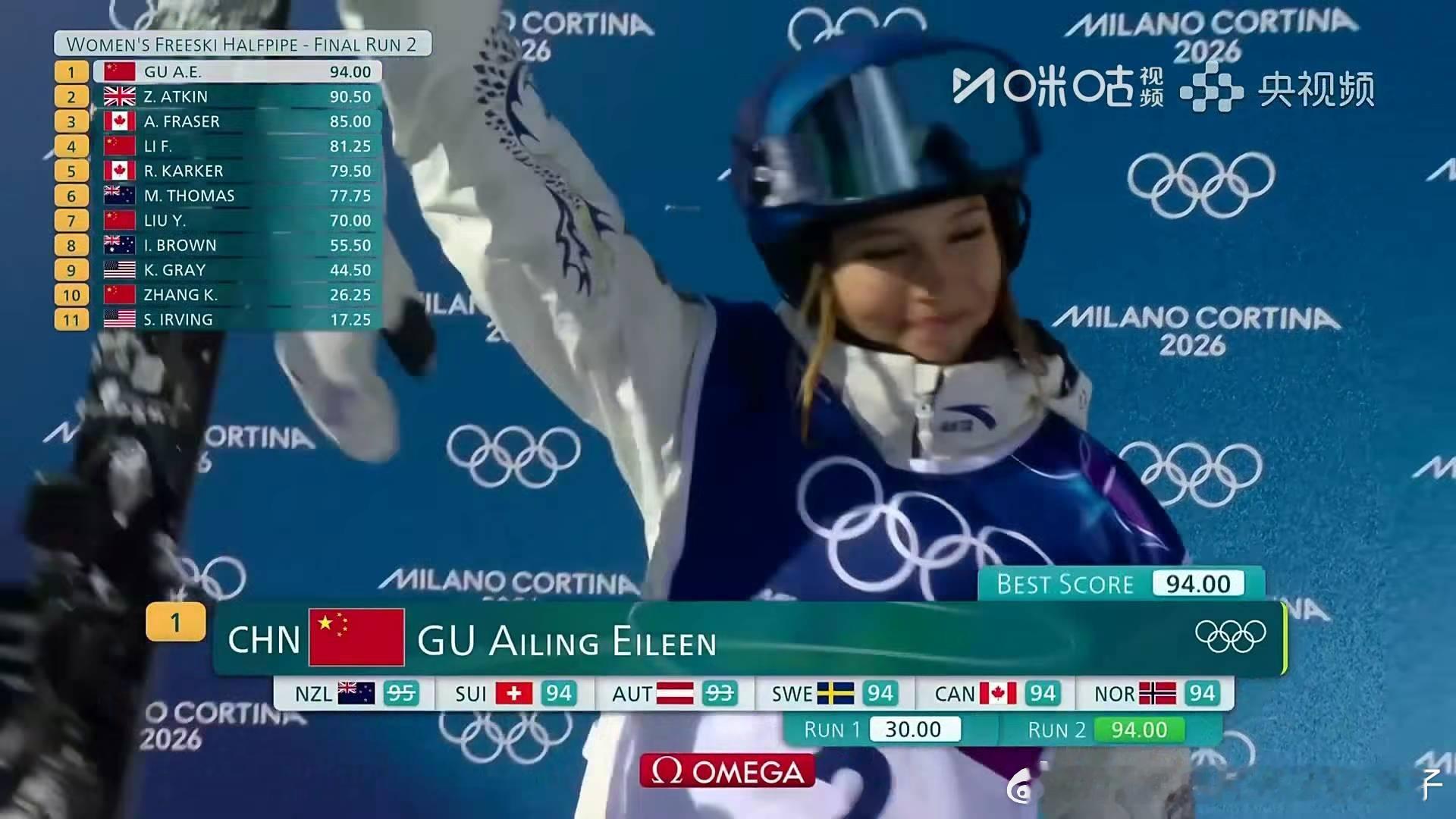 女子U型场地决赛谷爱凌决赛正常进行 2026年米兰冬奥会自由式滑雪女子U型场地决赛:谷爱凌第二滑发挥出色,获得94.00分!