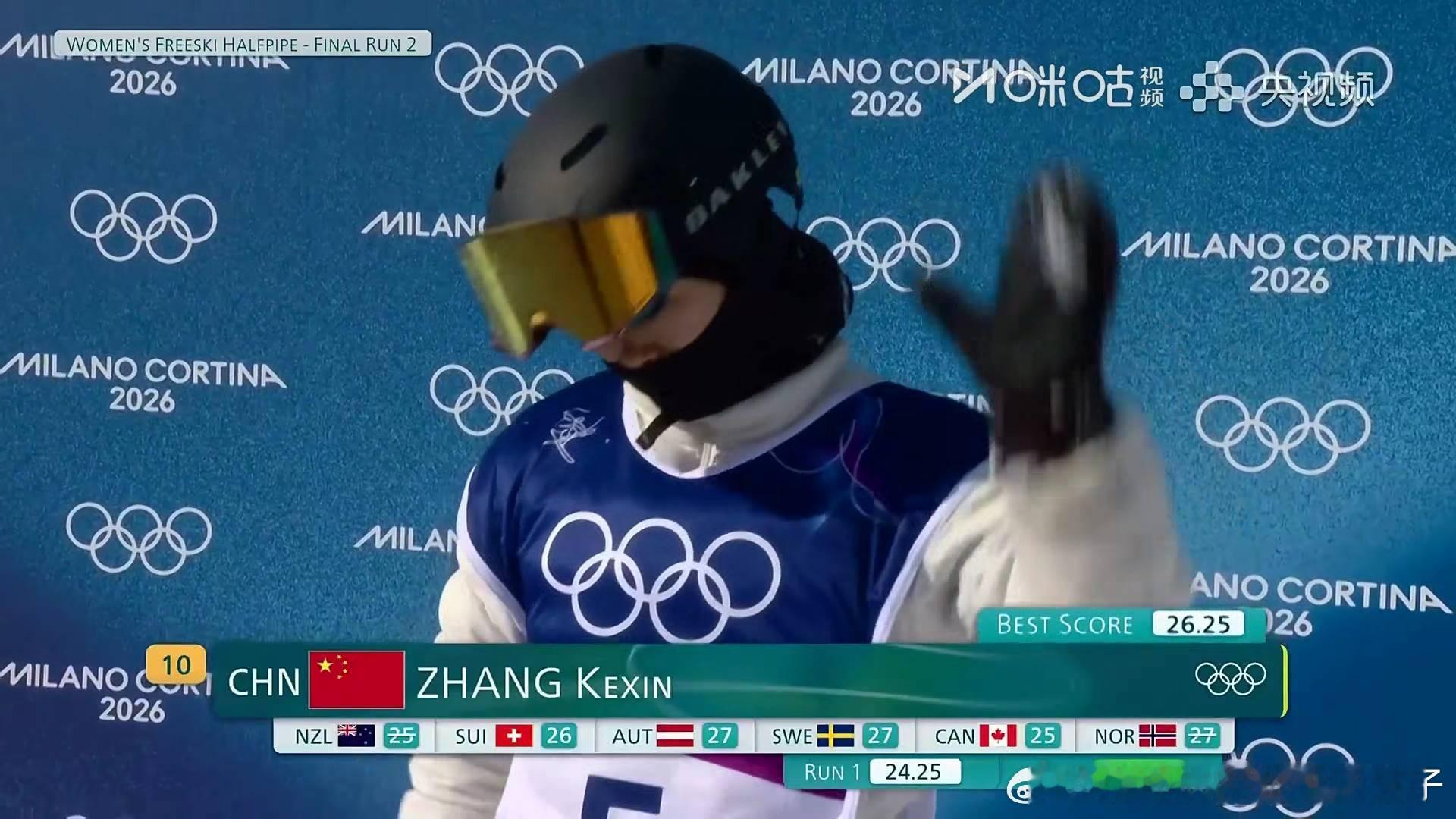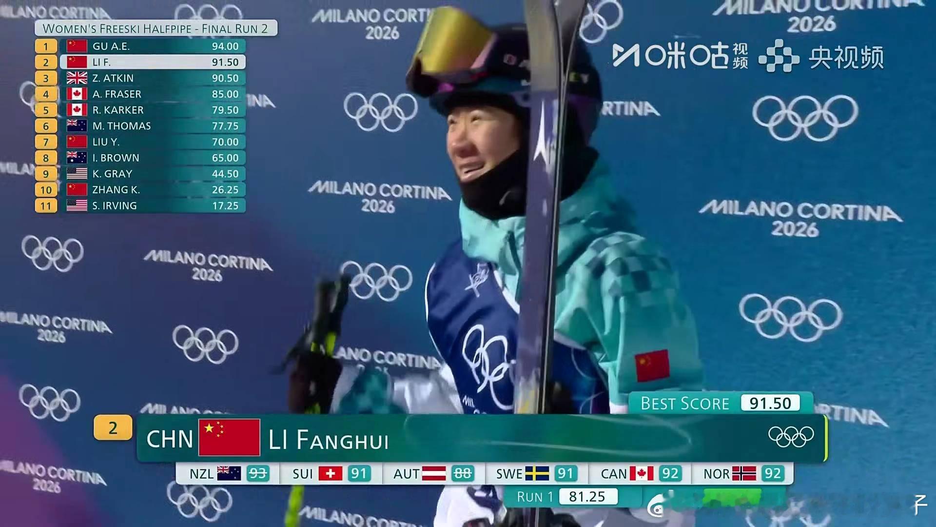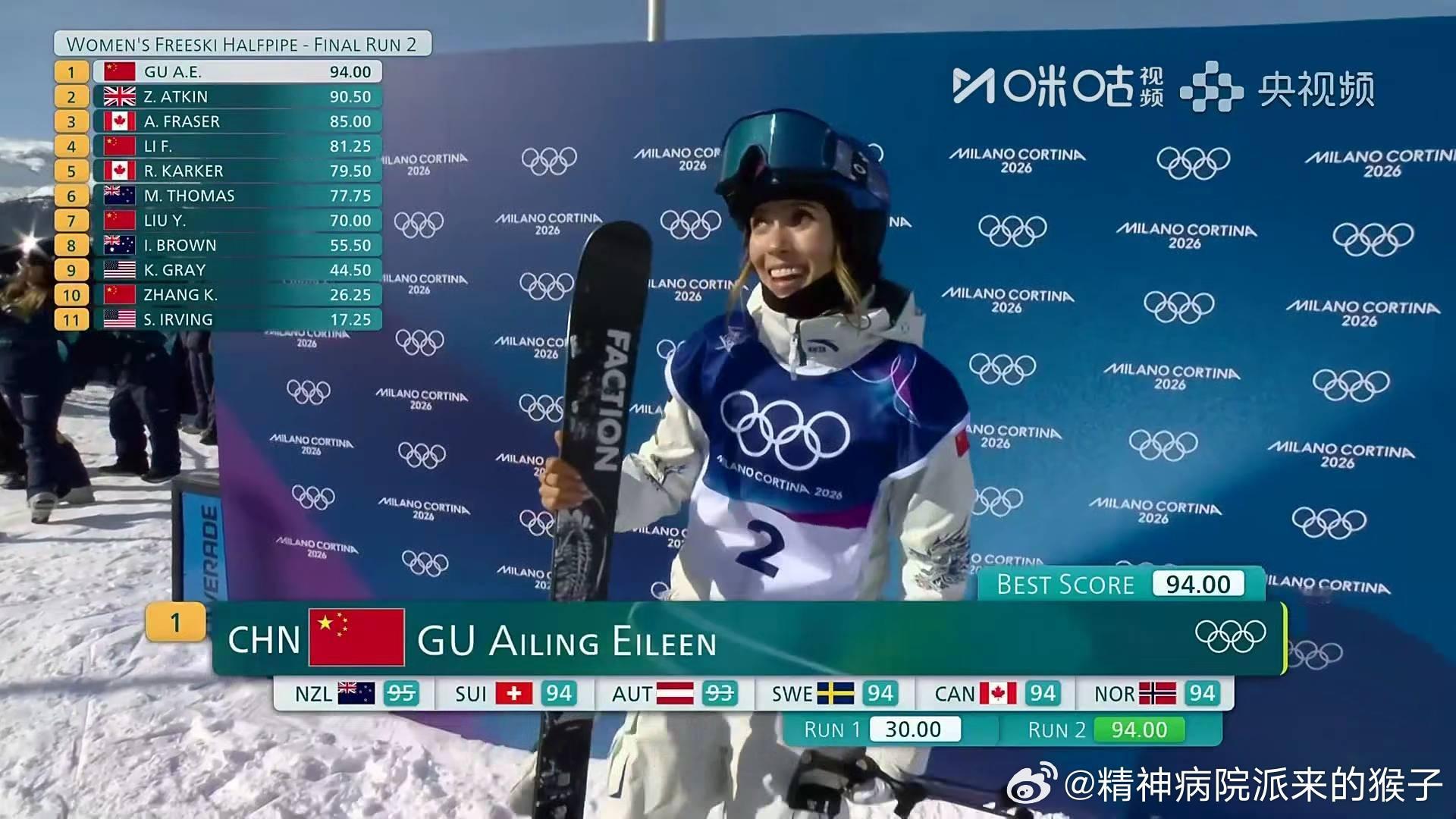女子U型场地决赛米兰冬奥会 2026年米兰冬奥会自由式滑雪女子U型场地决赛第二轮:谷爱凌获得94.00分,暂列第一位李芳慧获得91.50分,暂列第二位刘奕杉暂列第七位张可欣暂列第十位