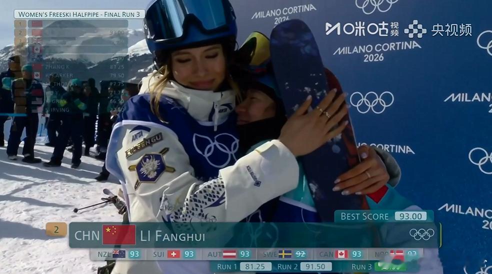 谷爱凌李方慧拥抱李方慧93分!基本与谷爱凌锁定金银牌了!李方慧银牌谷爱凌金牌