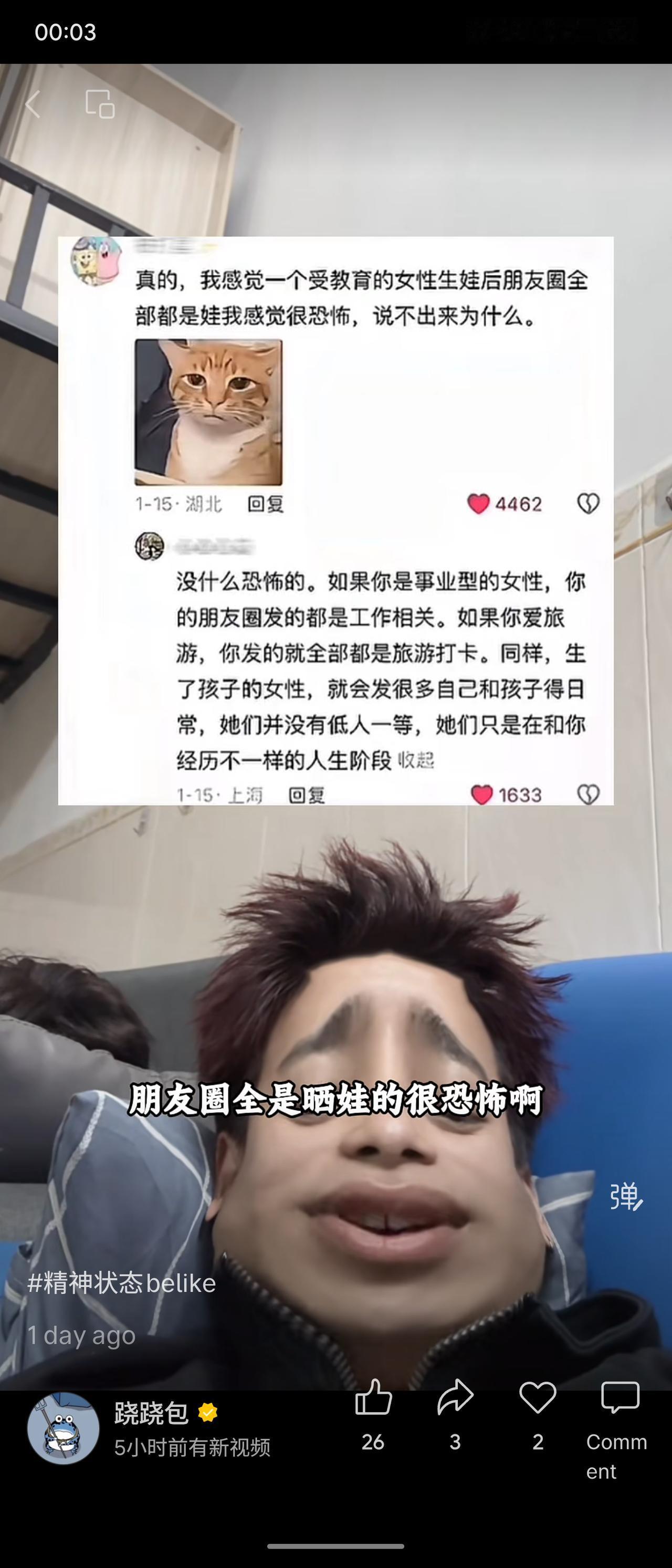 讨论女性生育后朋友圈变化:有人觉得“全是晒娃很恐怖”,认为失去自我;有人反驳这只是人生阶段不同,就像事业型发工作、爱旅游发打卡一样,并非低人一等。